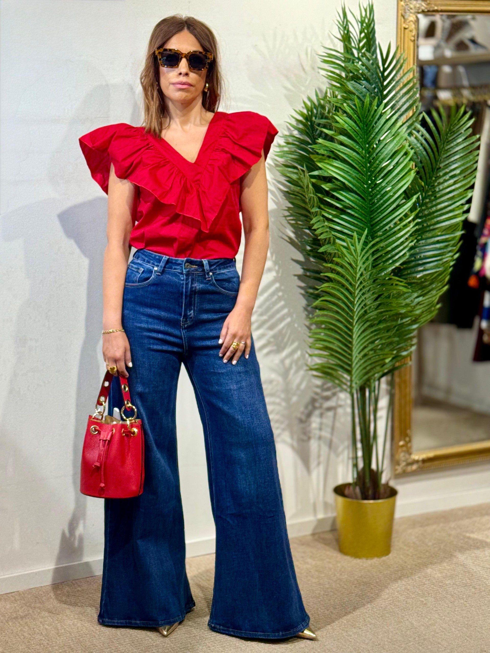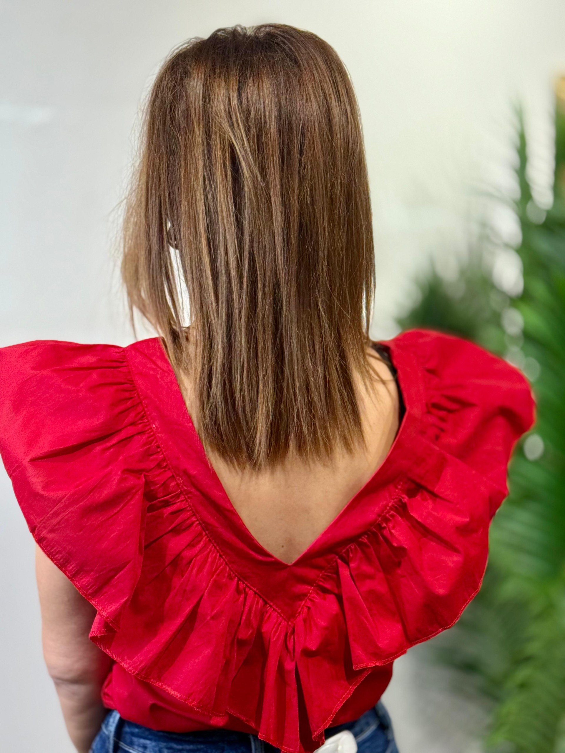 Top escote en Pico y Volantes en hombros en color Rojo. Corte recto y tejido de algodón.