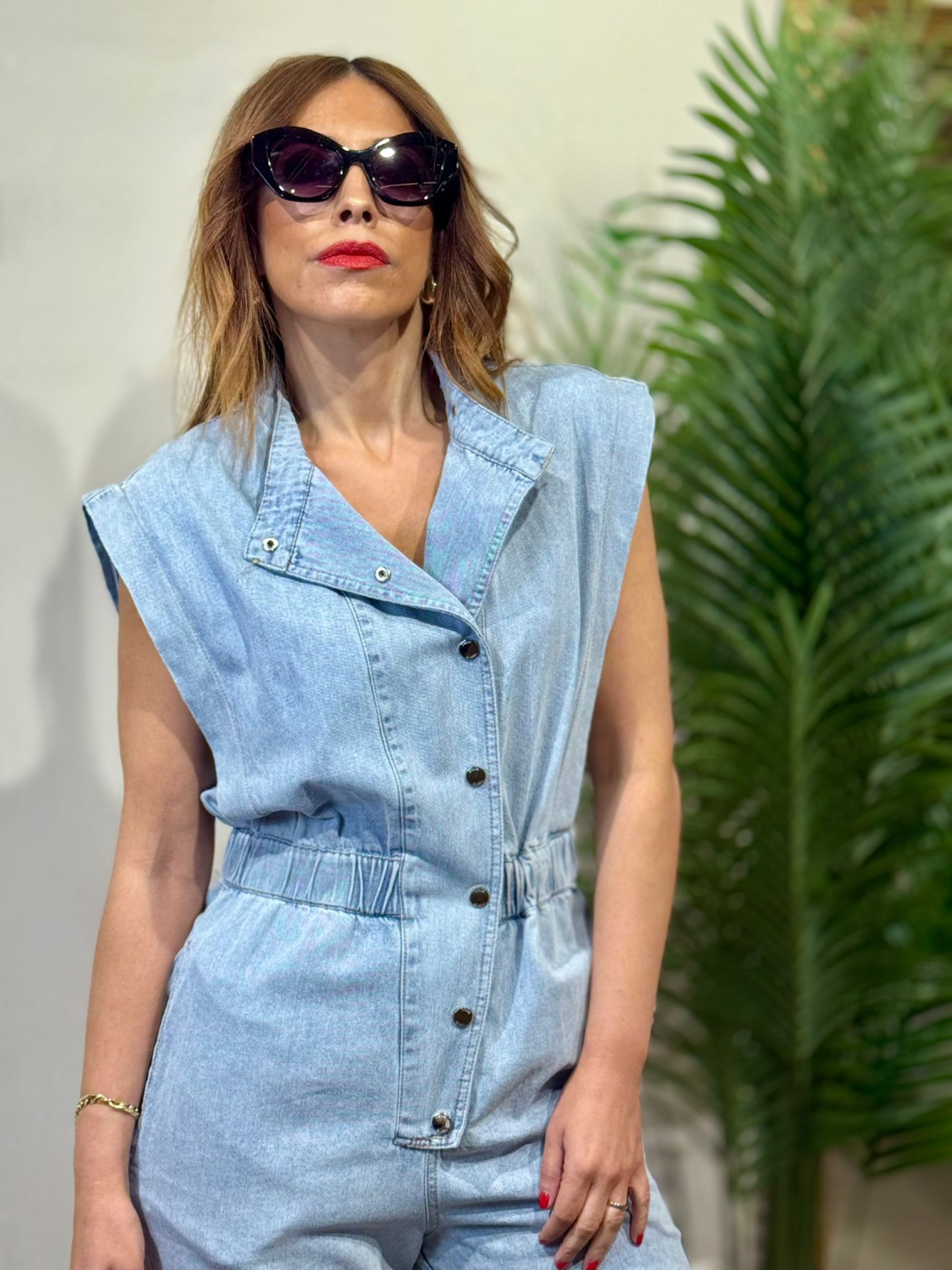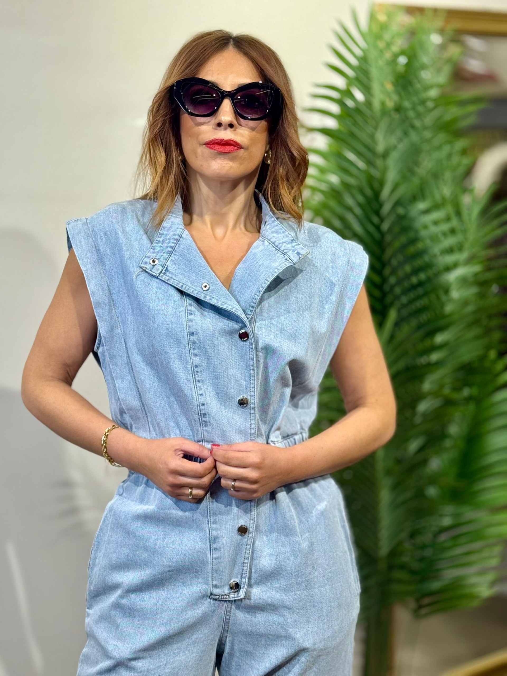 Buzo Denim azul. Botonadura central de corchetes y bolsillos laterales. Cintura engomada corte recto.