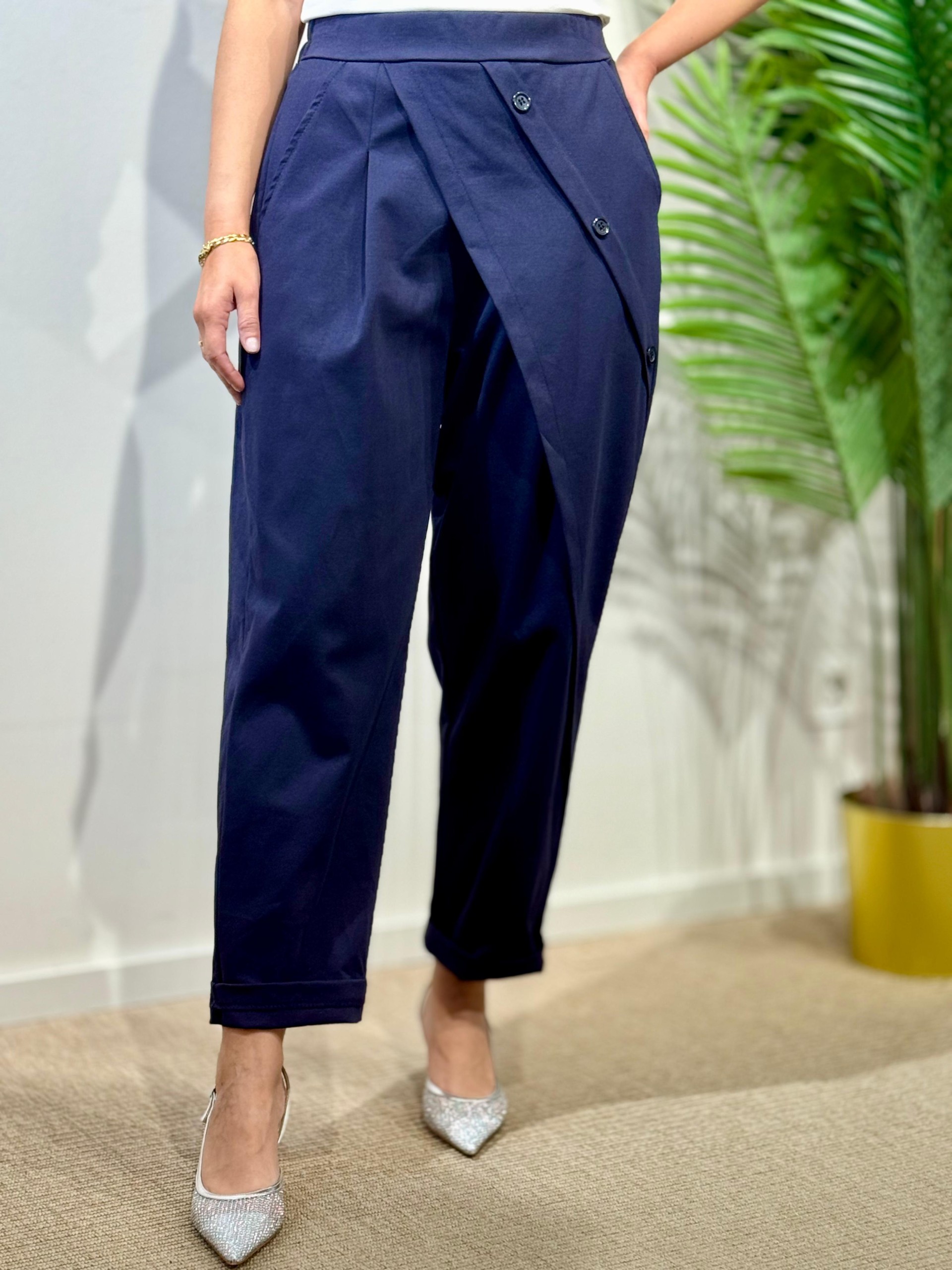 Pantalón Baggie Botones Azul marino. Engomado en cintura y Lleva Bolsillos laterales.