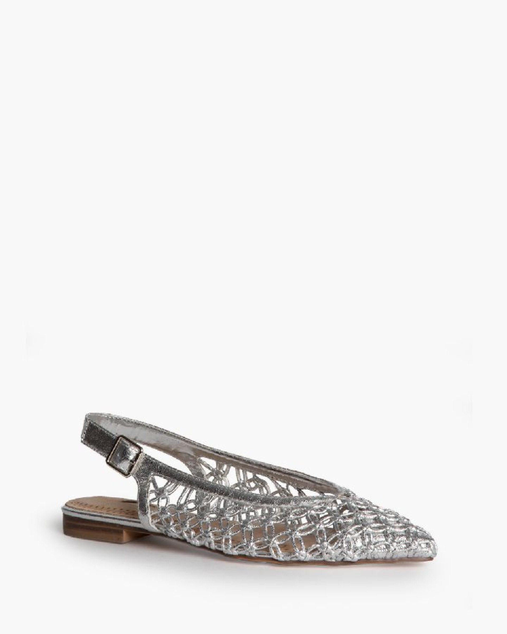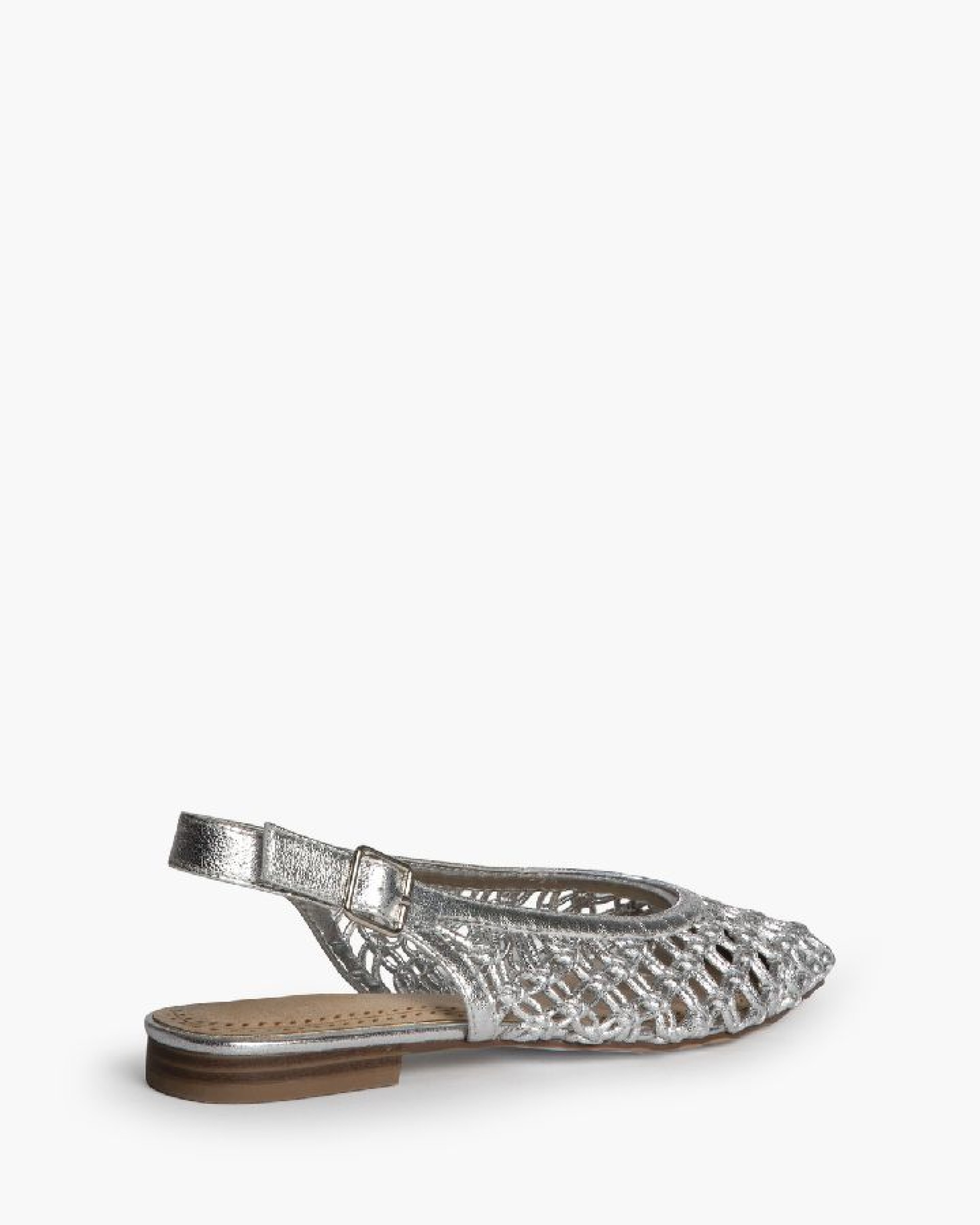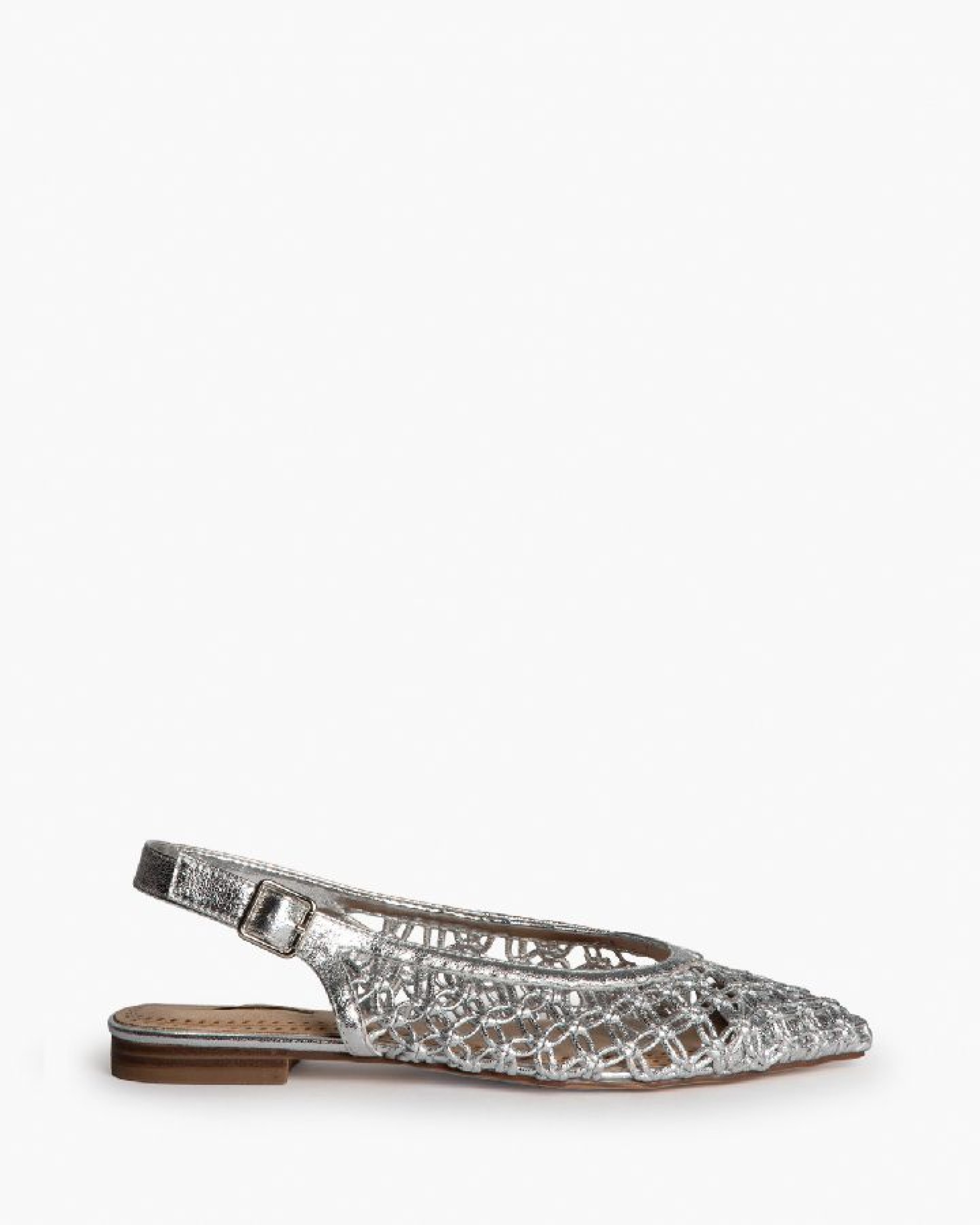 Bailarina destalonada. Corte trenzado. Acabado en punta, escote re-dondo. Cierre mediante hebilla.