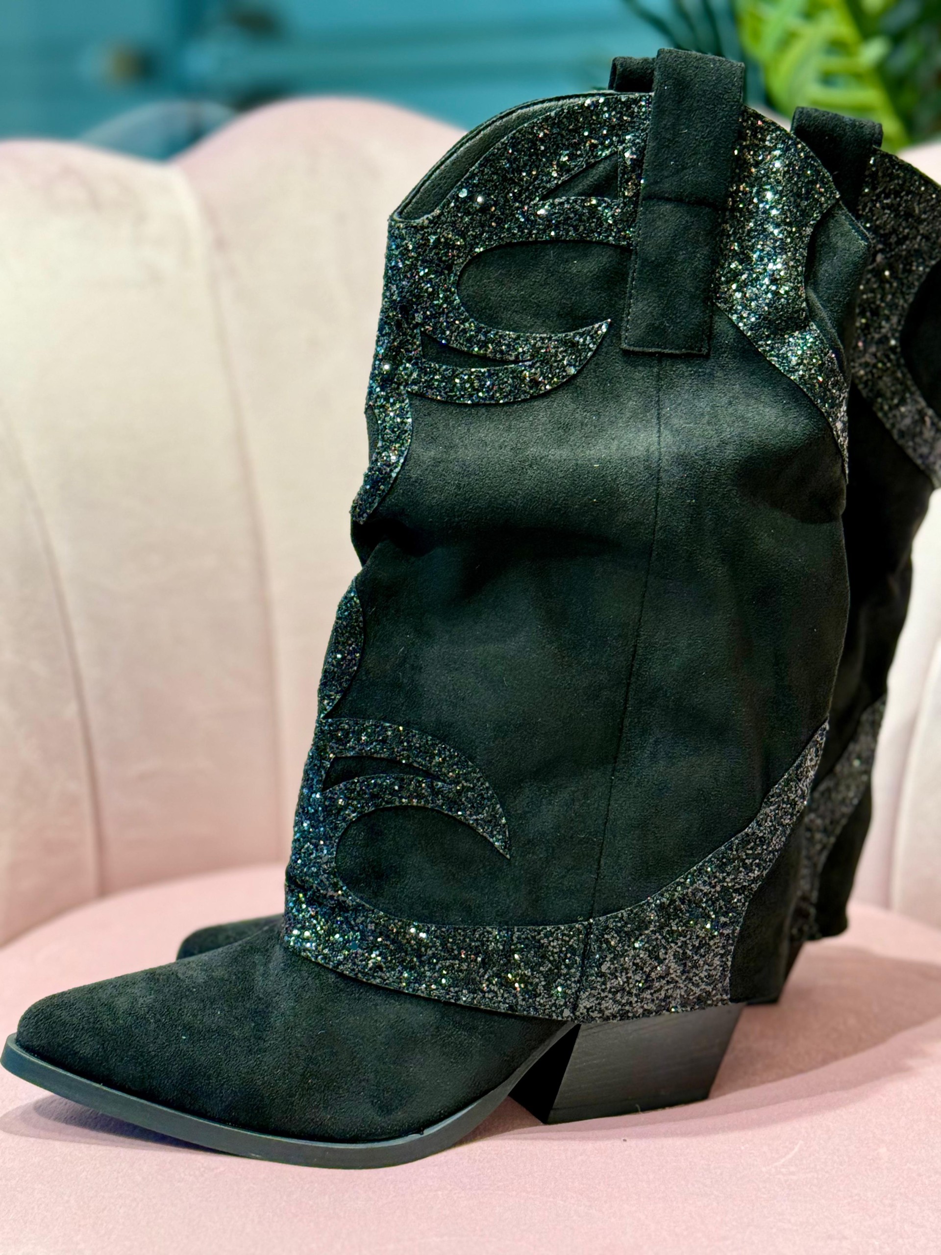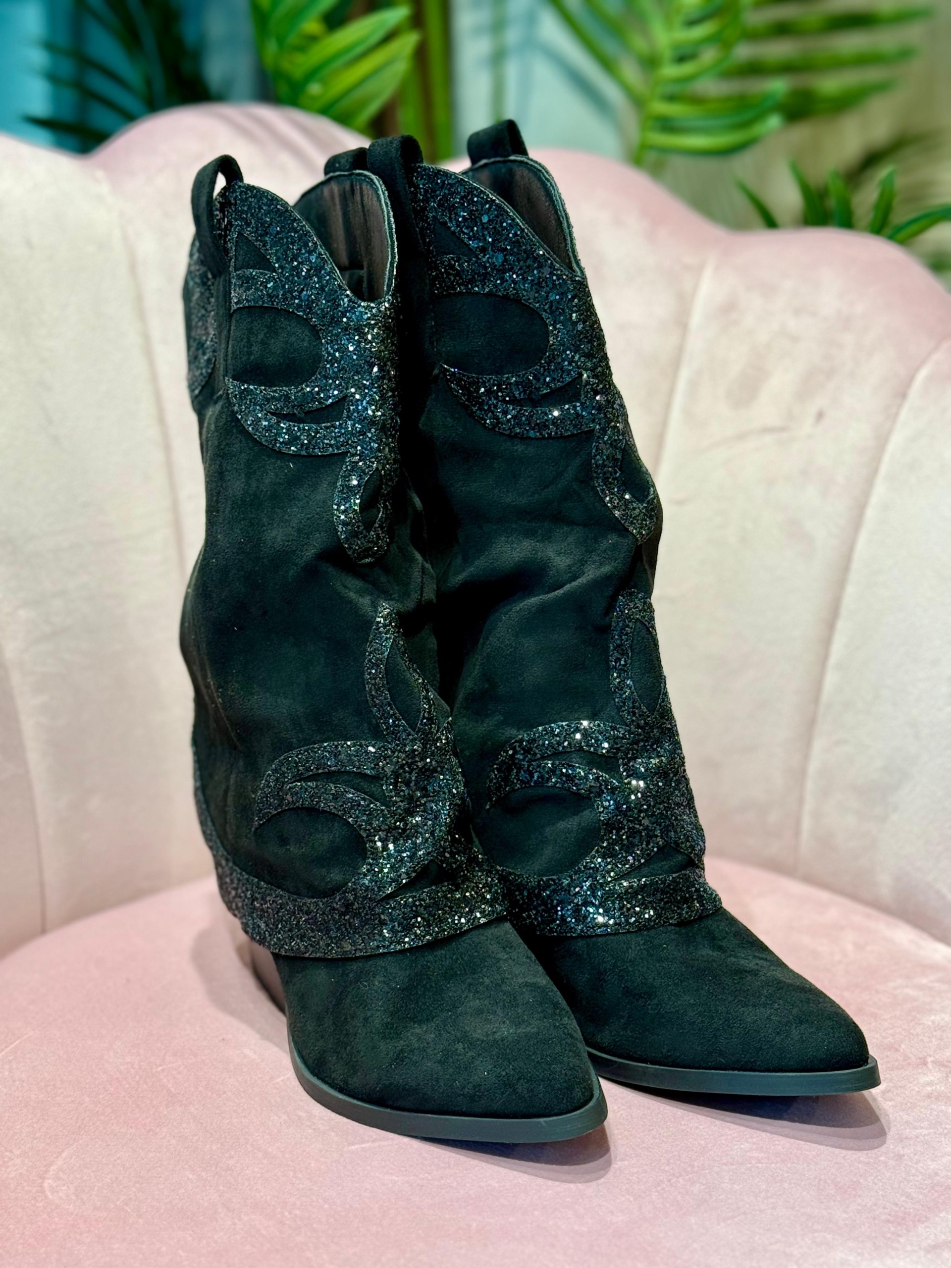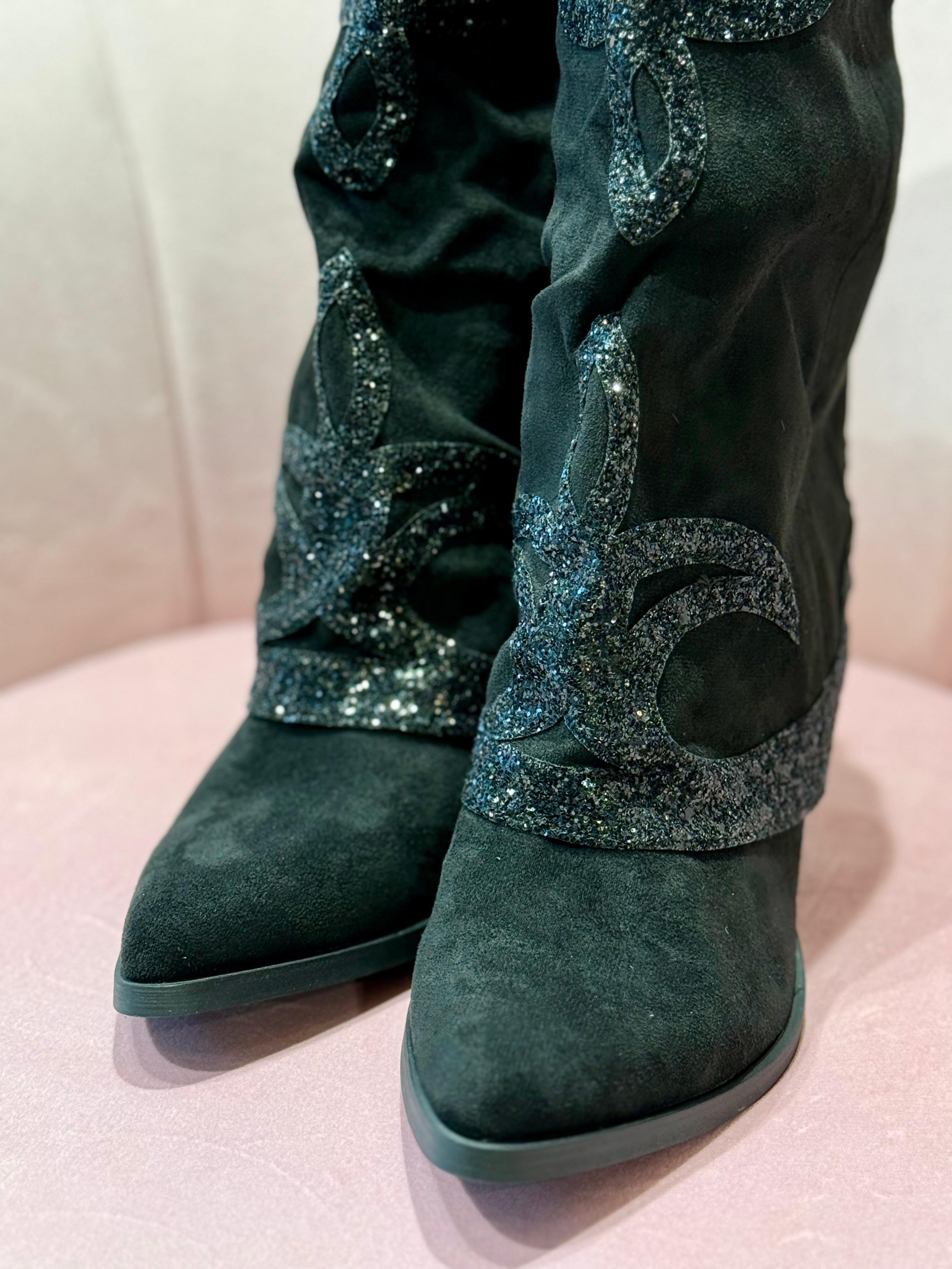 Bota campera purpurina black. Con tejido de ante y Tacón ancho de 7 cm de altura.