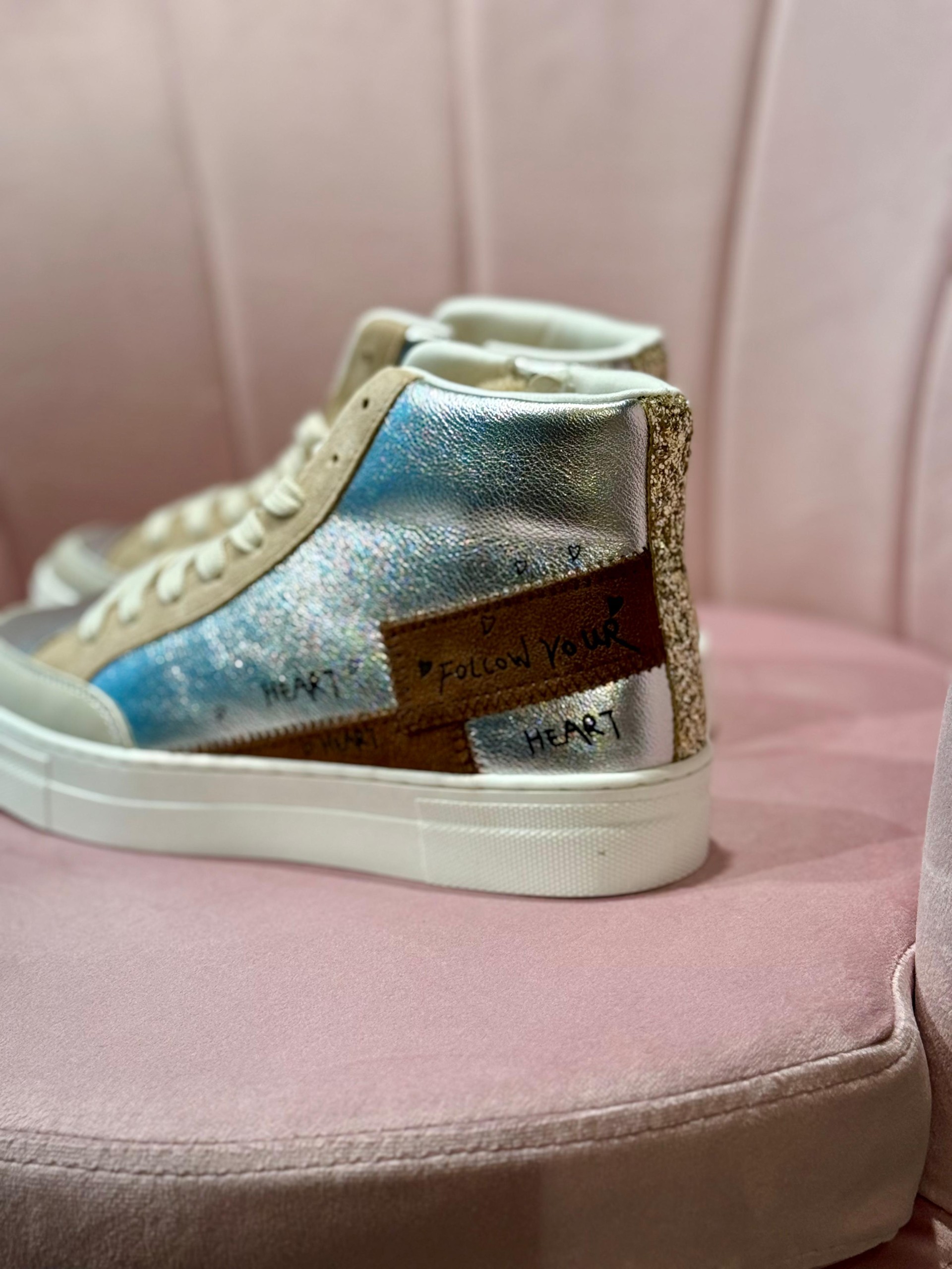 Zapatilla abotinada metalizada plata y beige. Con lengüeta en borreguito beige y cremallera lateral.