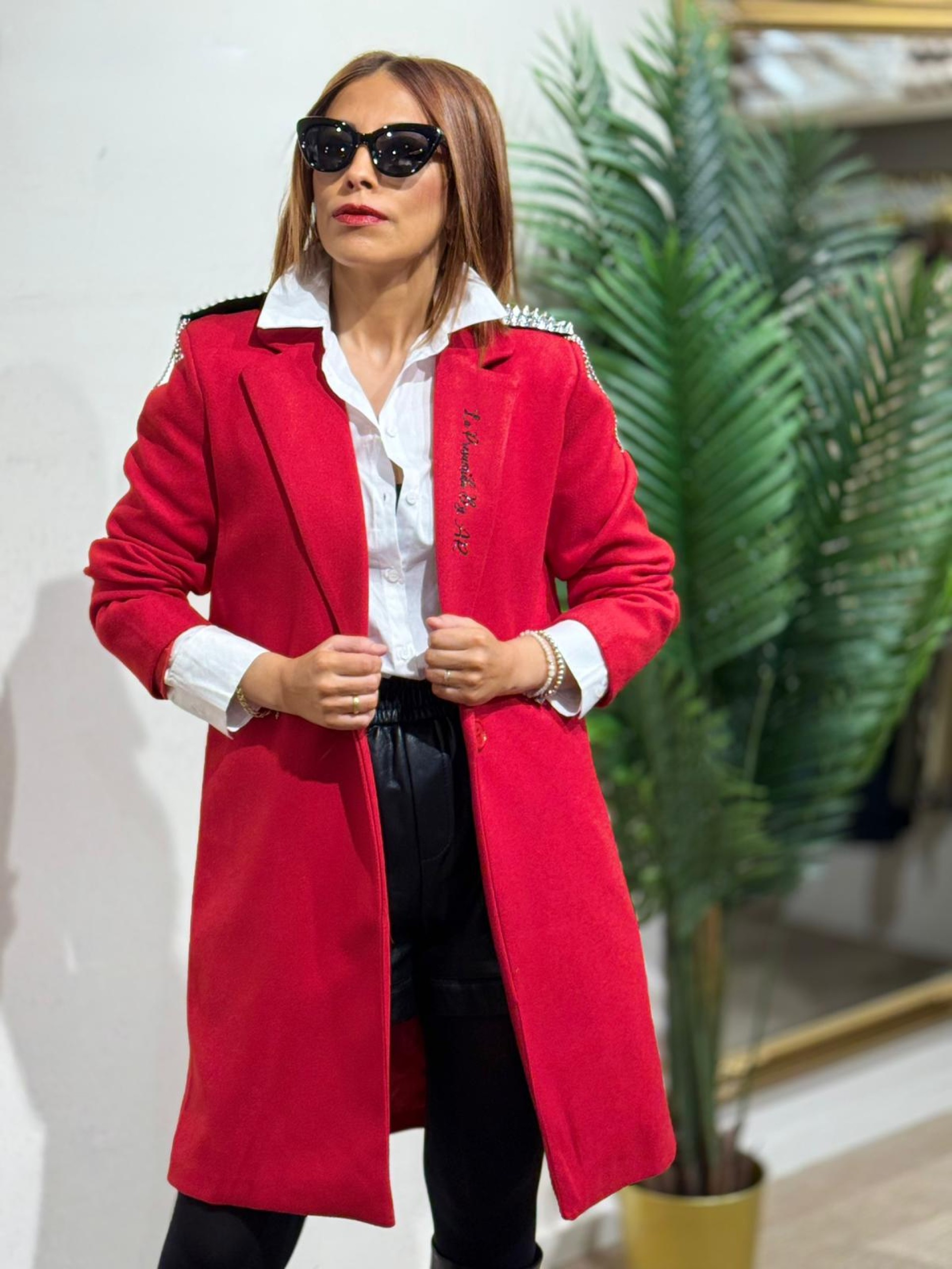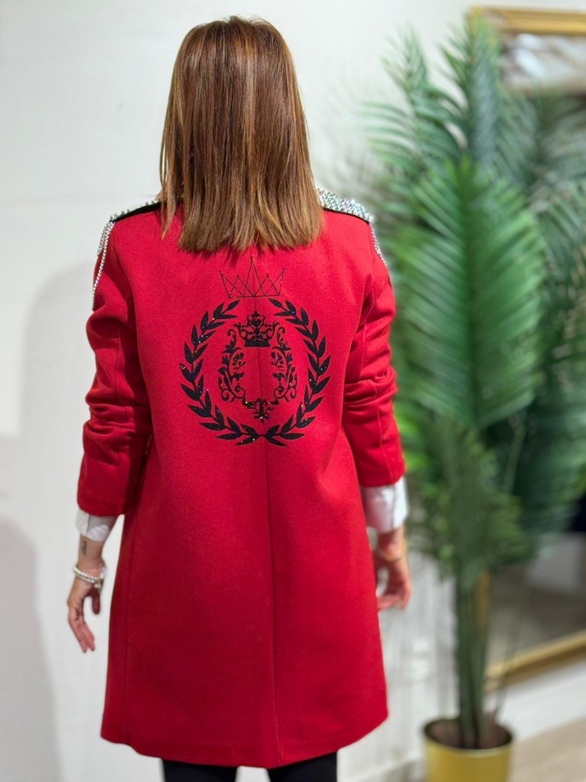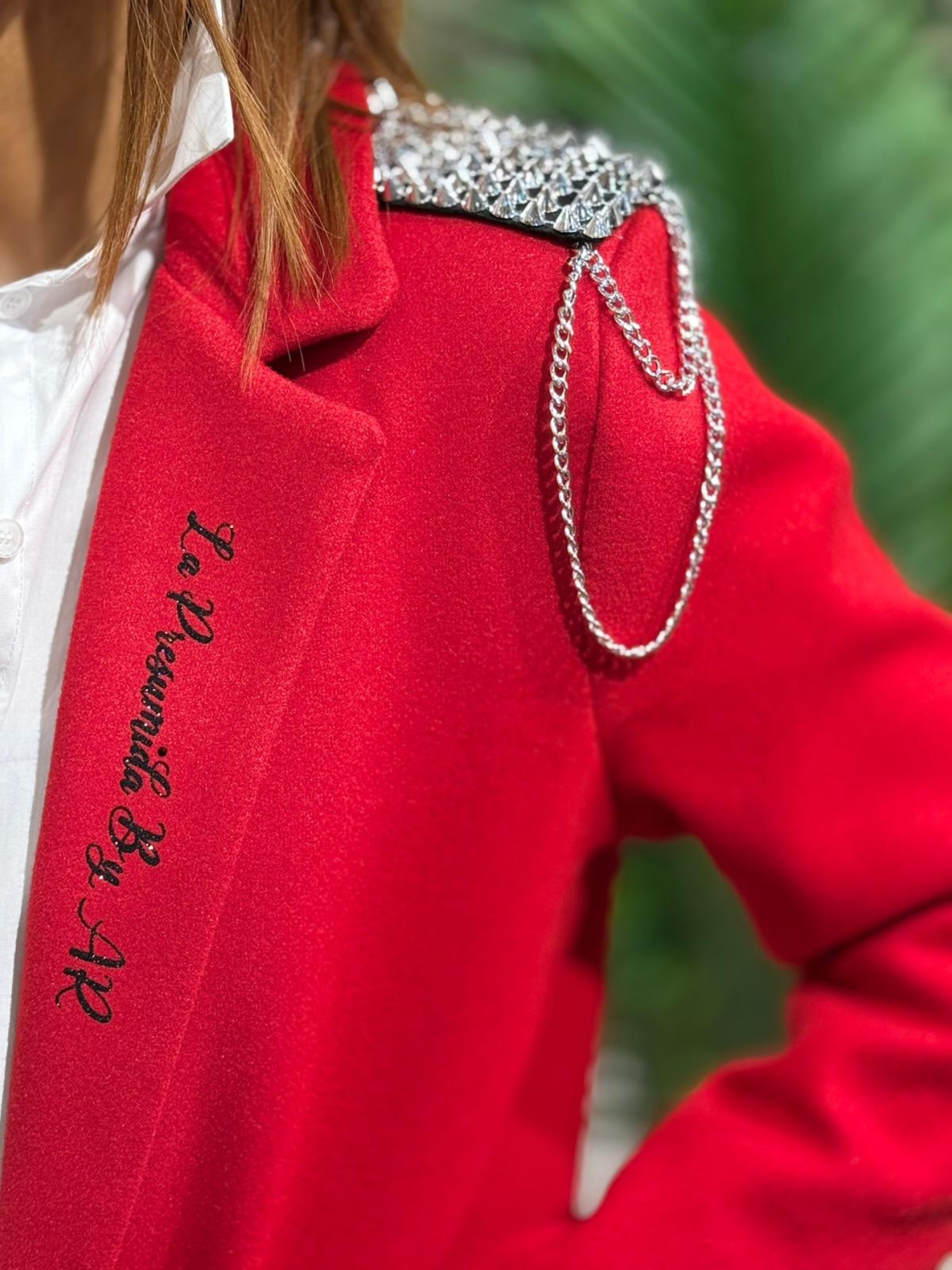 Abrigo escudo diseño LP rojo. Corte recto y forro interior. Lleva bolsillos y apliques con pinchos y cadenas desmontables en hombros. Estampación de escudo con glitter espalda.