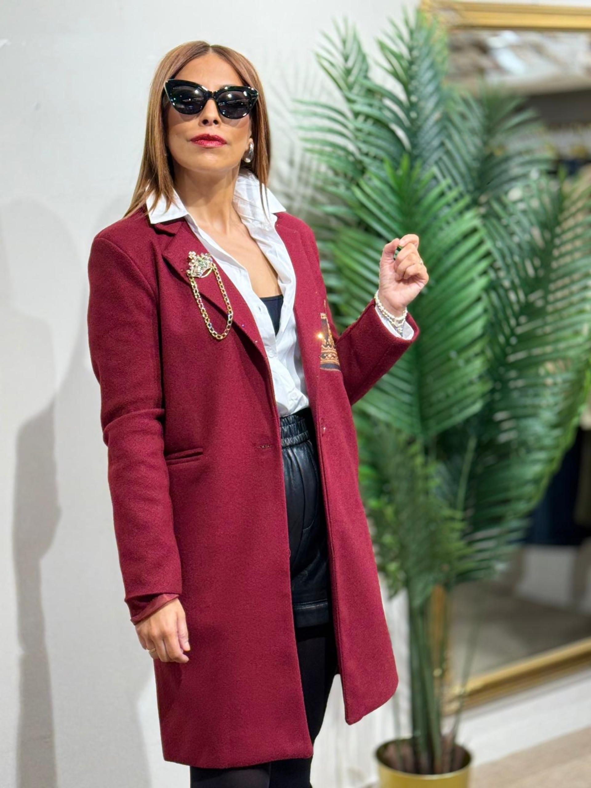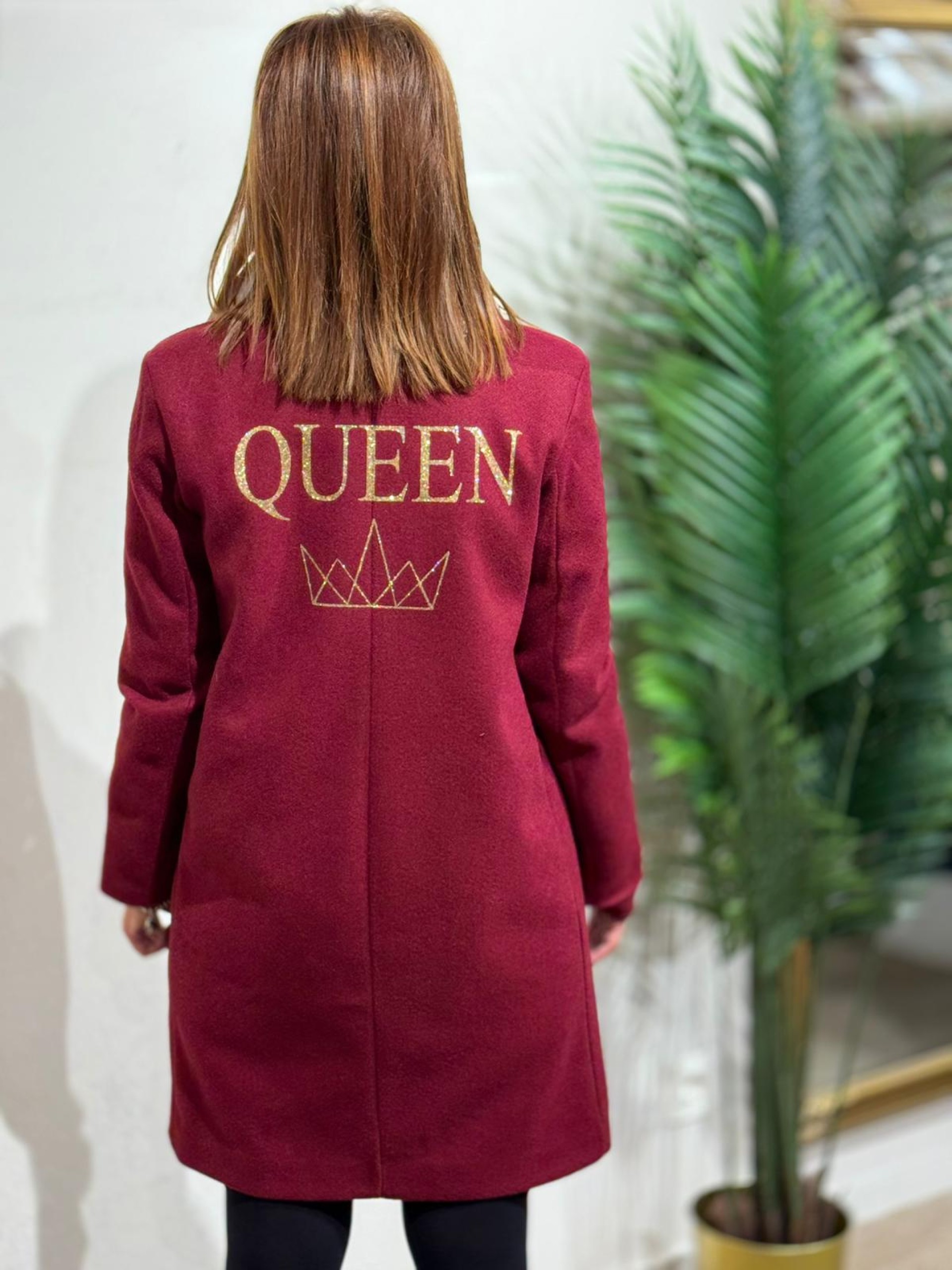 Abrigo QUEEN diseño LP burdeos. Corte recto y forro interior. Lleva bolsillos y broche de corona con cadena en solapa dorado. Estampación mensaje QUEEN en glitter en espalda.