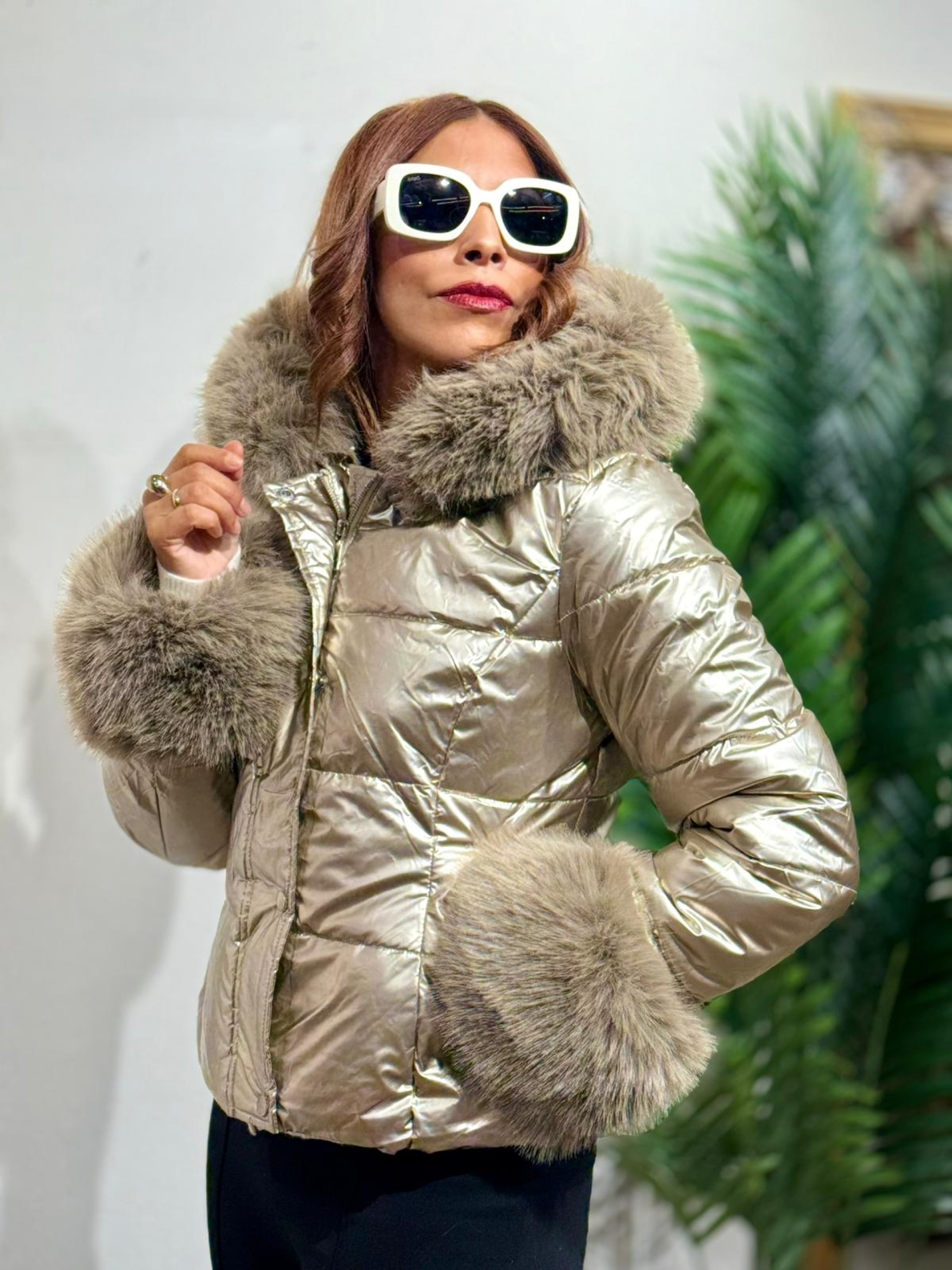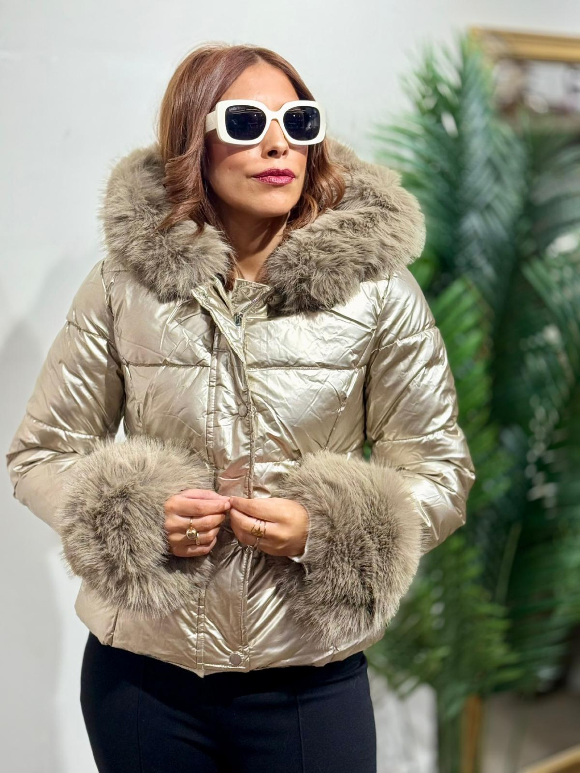 Plumífero acharolado capucha champán. Incluye puños y capucha de pelito desmontable. Lleva Bolsillos laterales y cremallera central.