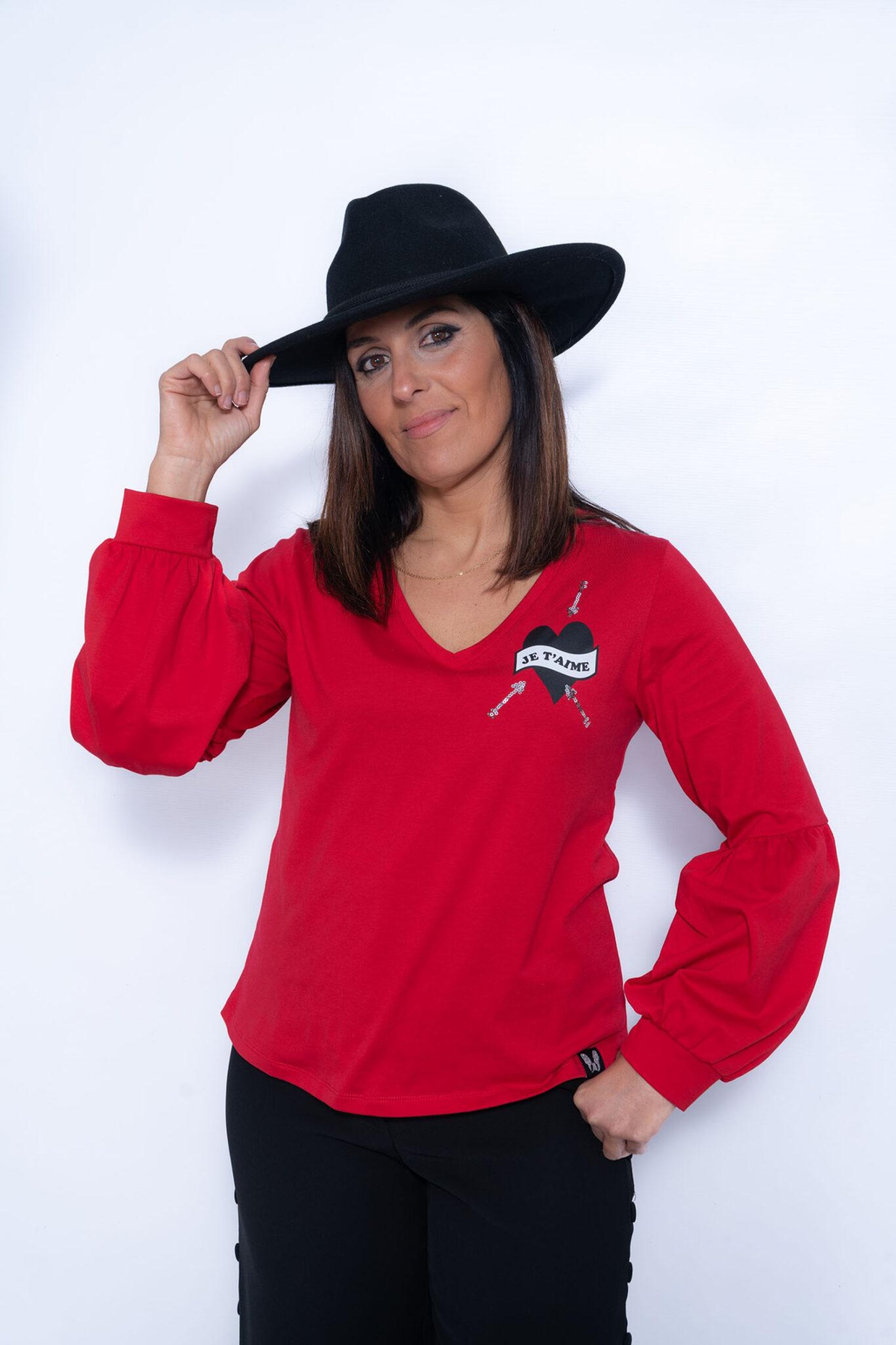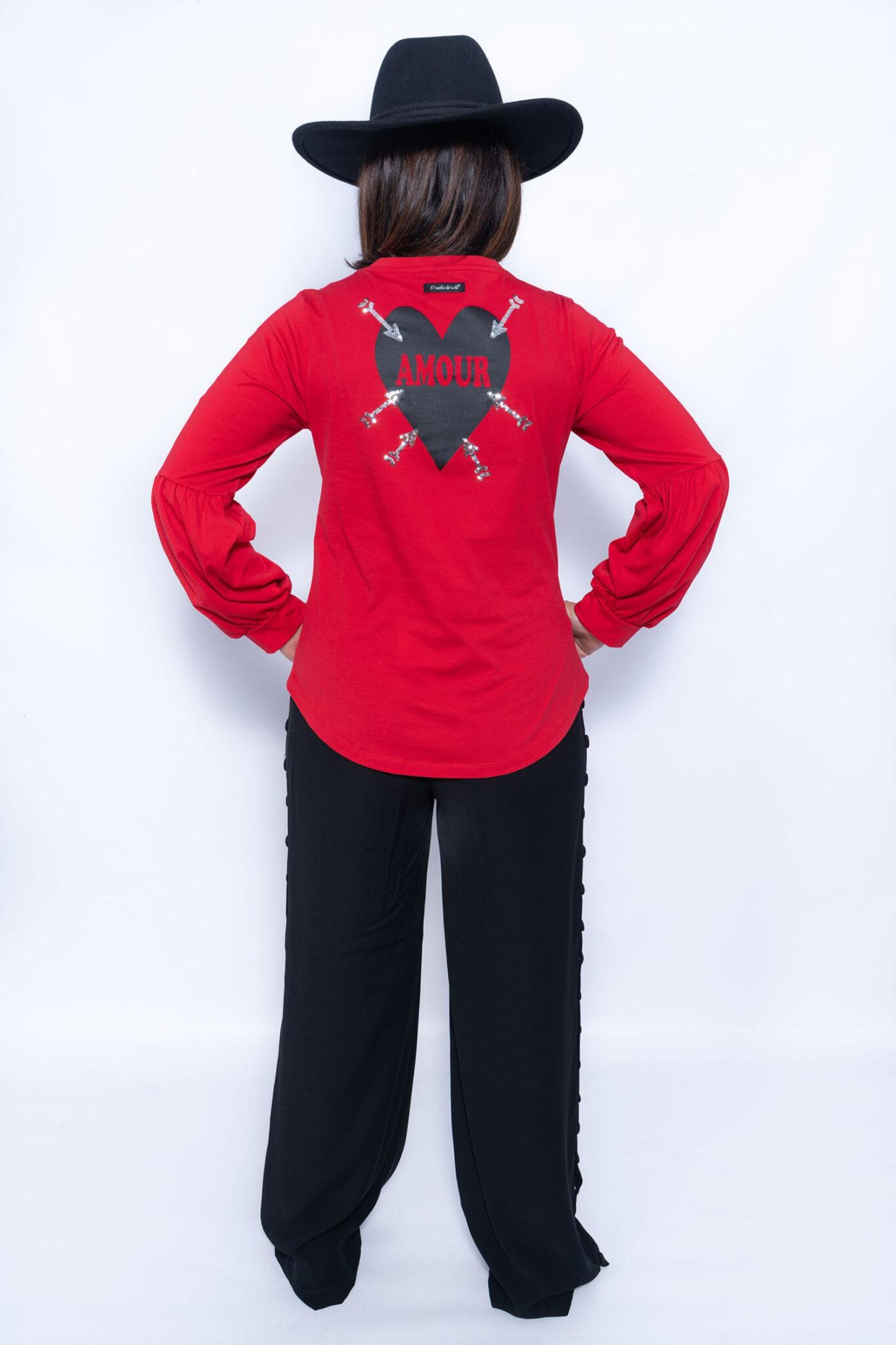 Camiseta en color rojo con escote en V y manga larga abullonada. Maxi print corazón negro letras rojas y combinado con flechas en paillettes plateadas. Bajos redondeados y más larga por detrás.