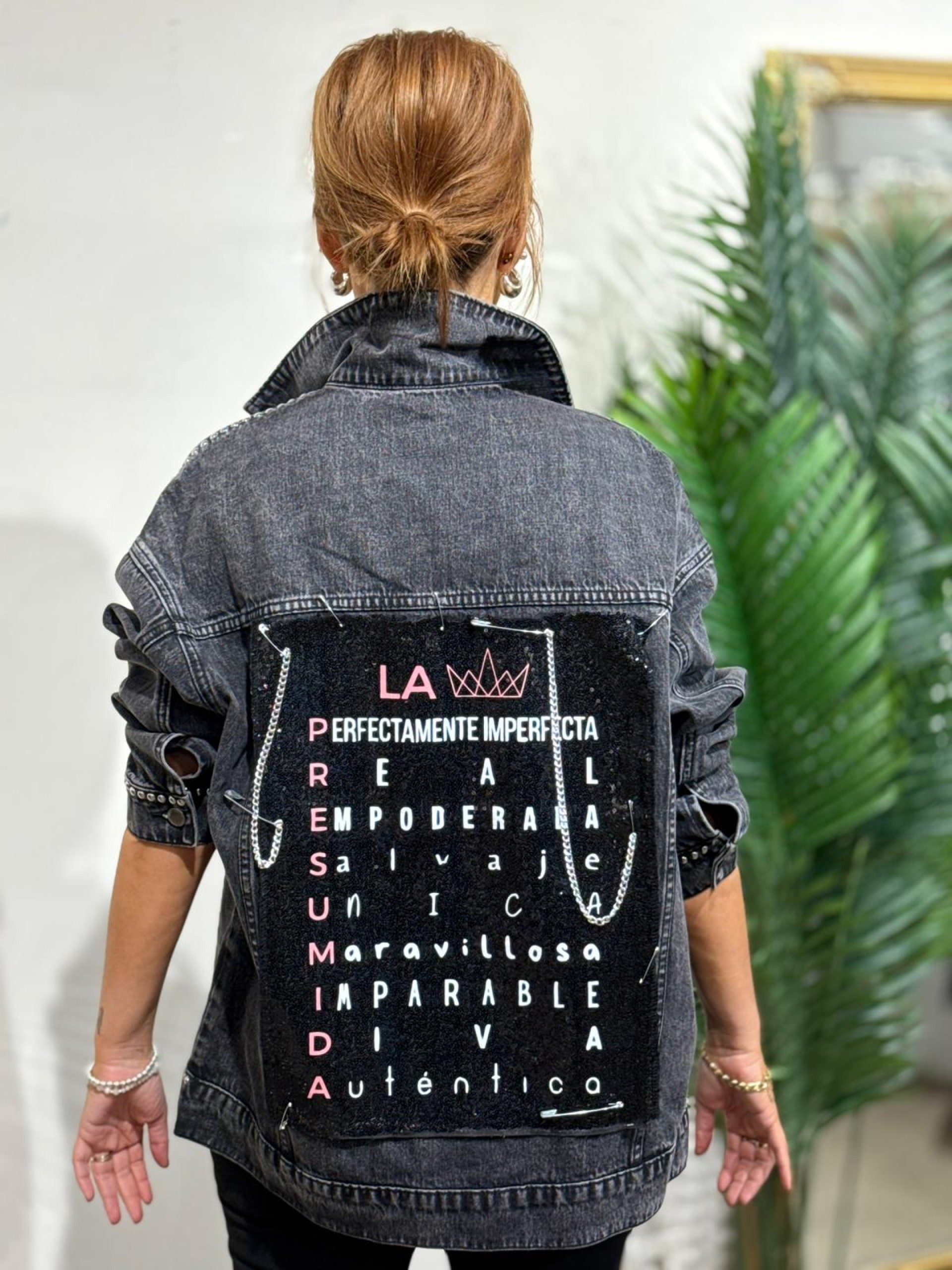 Cazadora diseño LP Mensaje gris. Corte oversize y tejido denim. Contiene tachuelas plateadas y parche con acróstico La Presumida desmontable de lentejuelas.