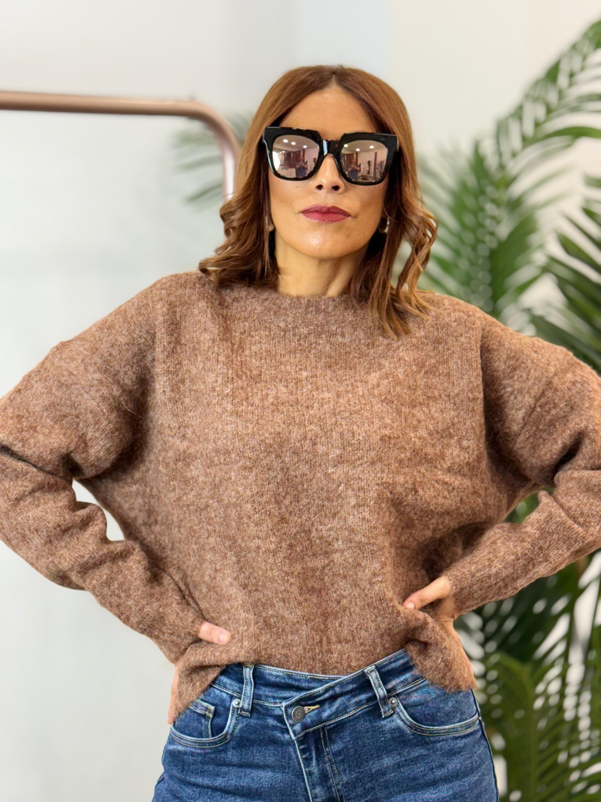 Jersey basic marrón jaspeado. Cuello redondo y corte oversize.