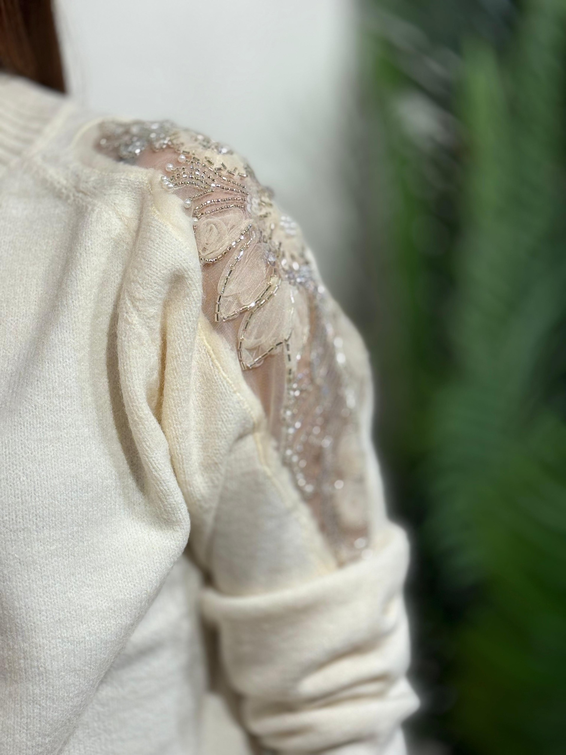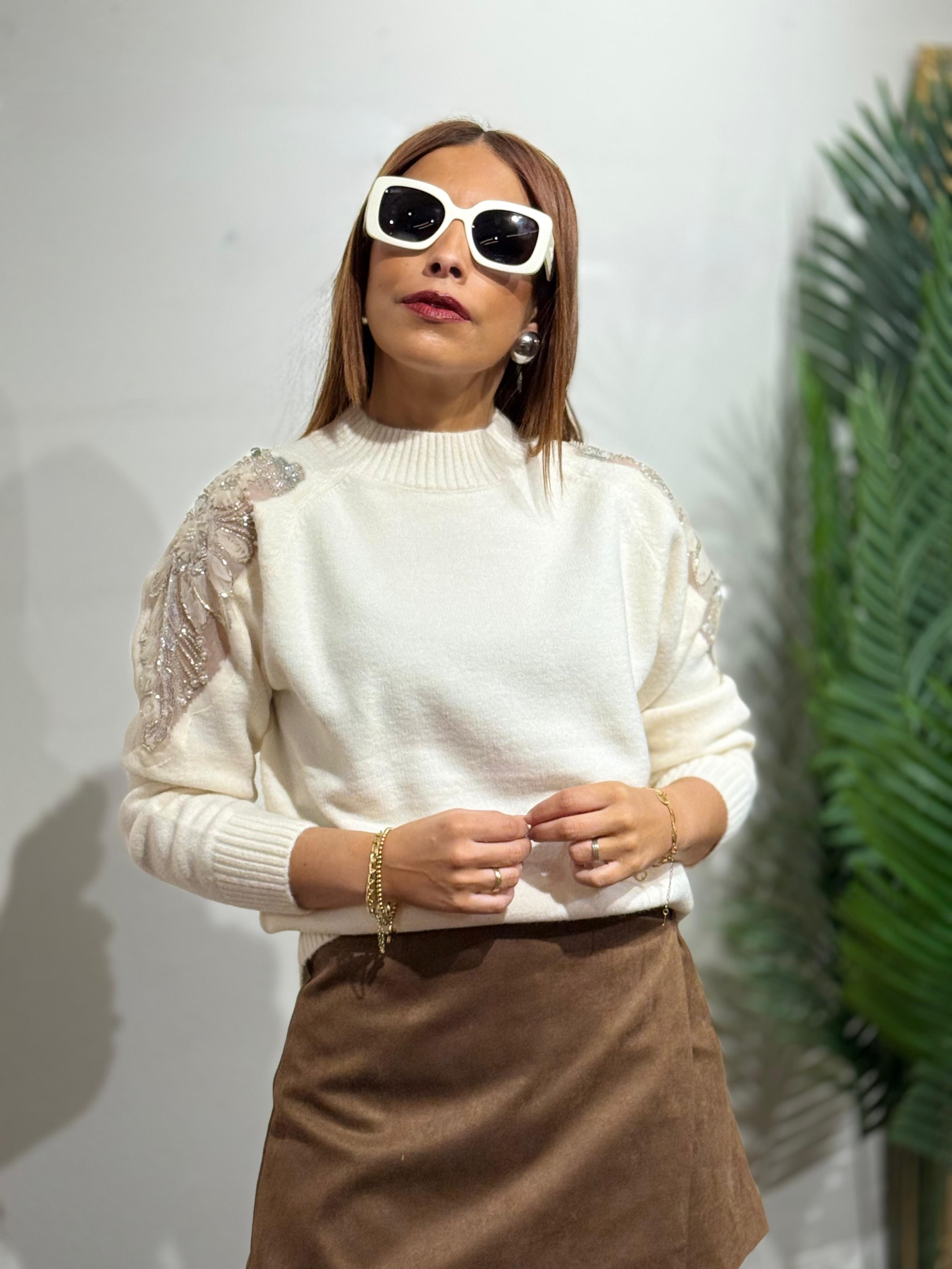 Jersey hombro transparente joya blanco crudo . Corte recto y cuello perkins.