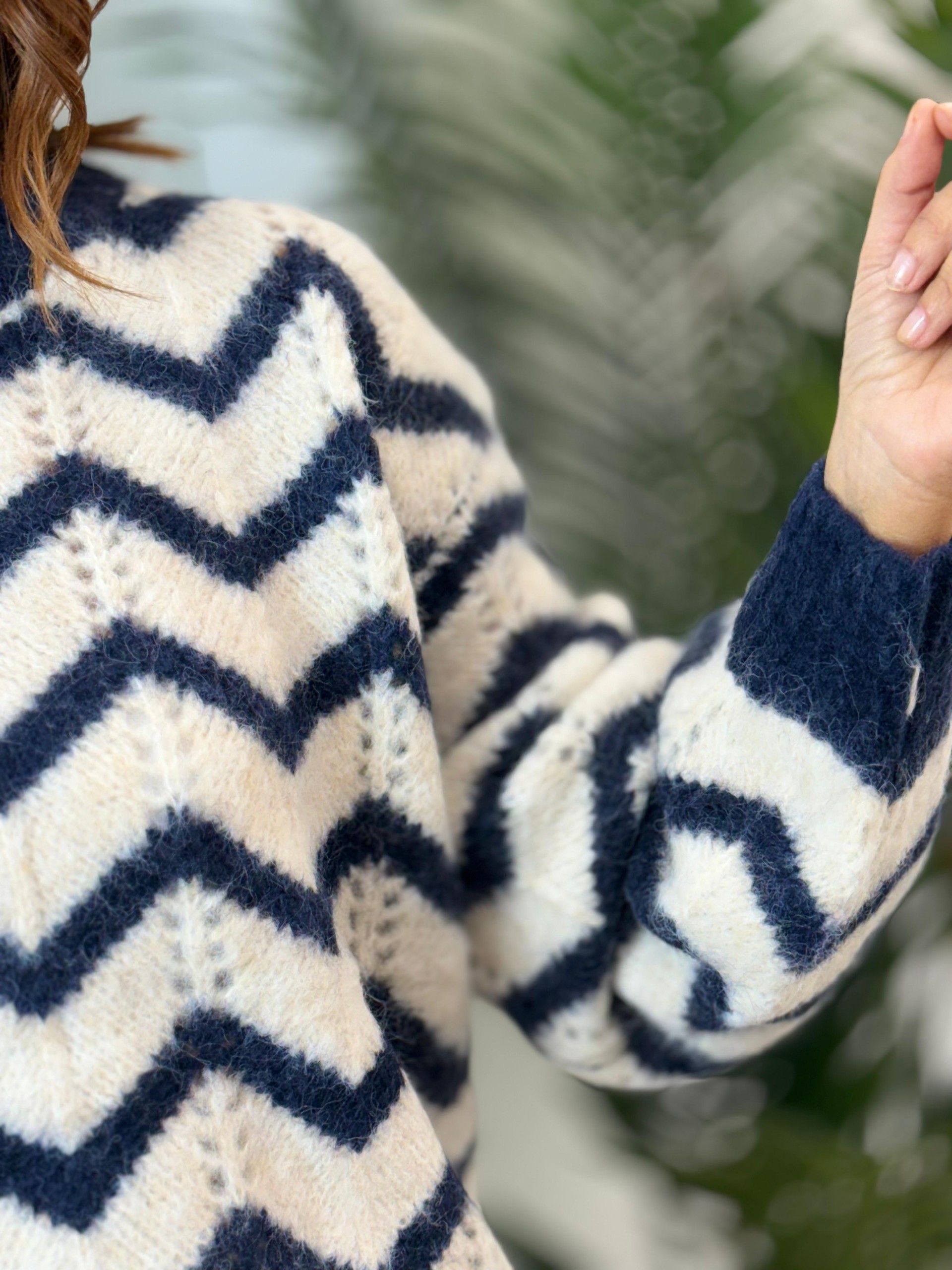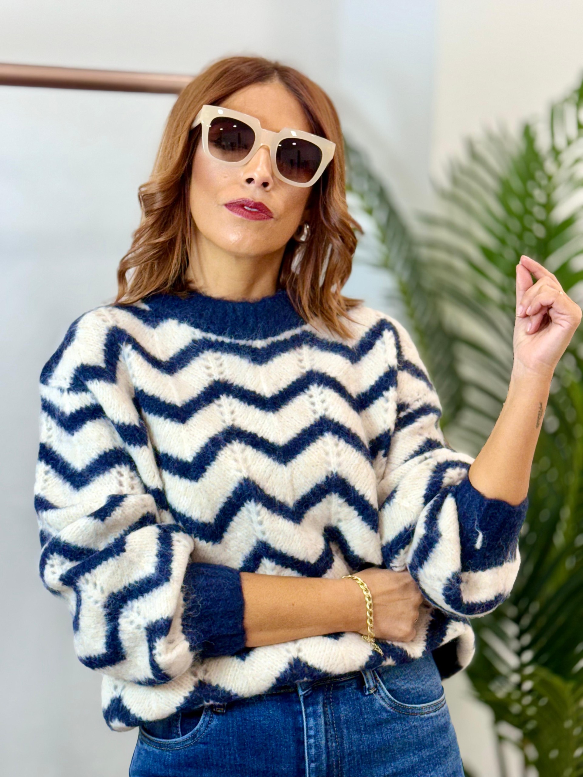 Jersey rayas azul y blanco .Cuello redondo y corte oversize. Troquelado.