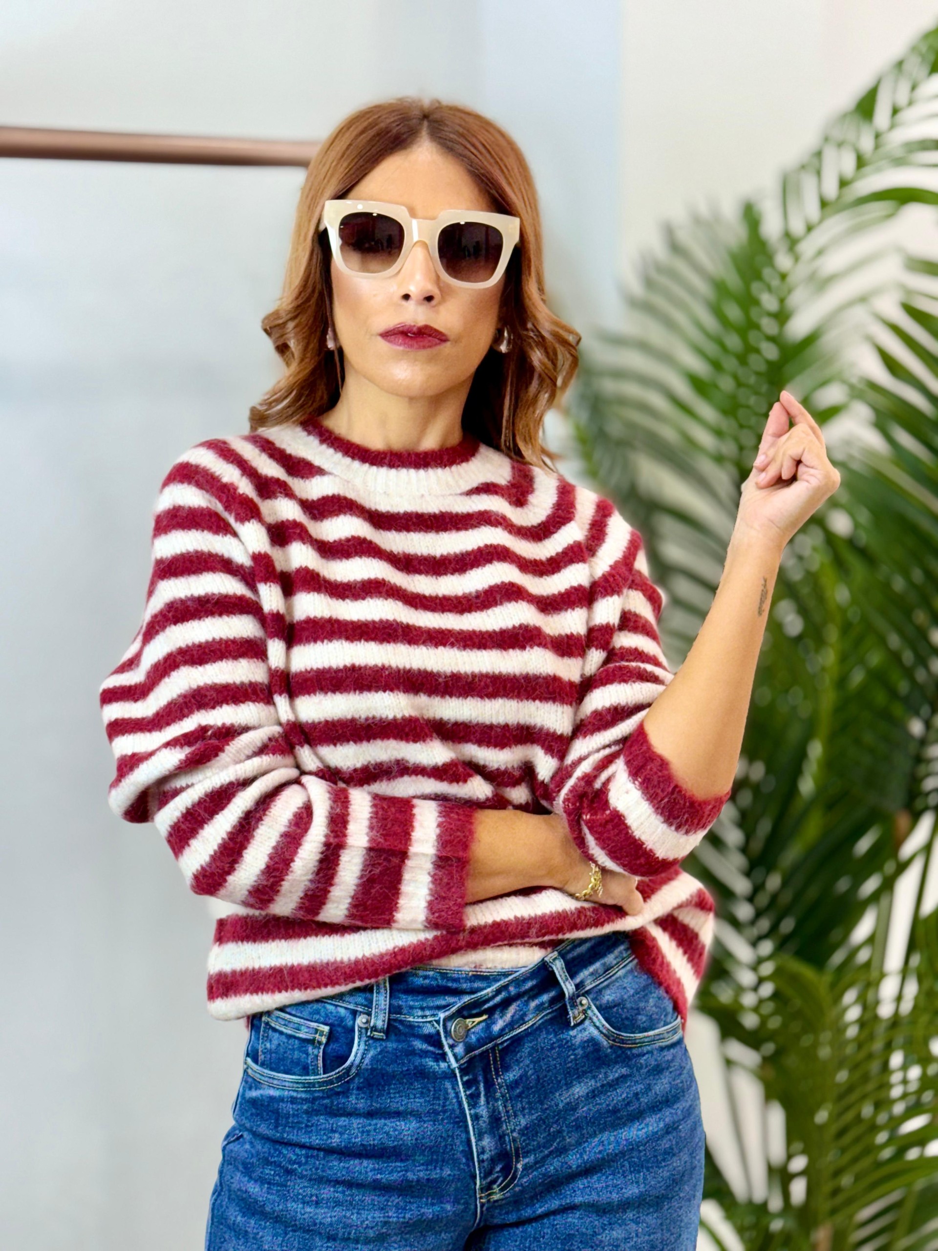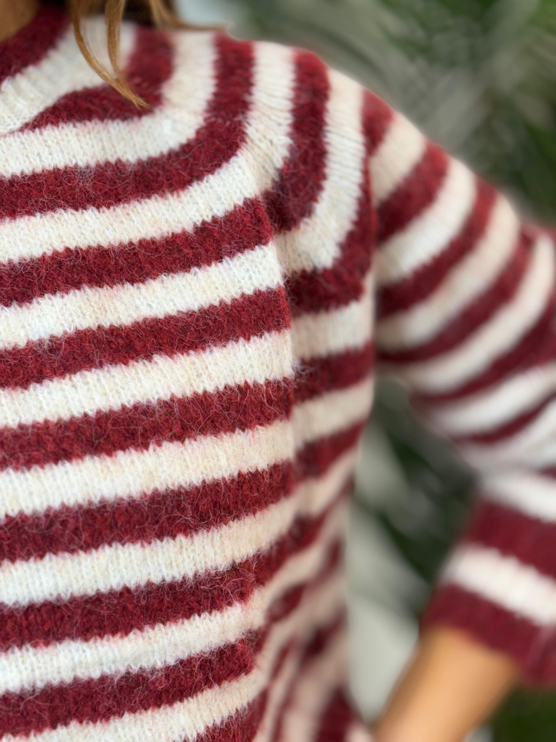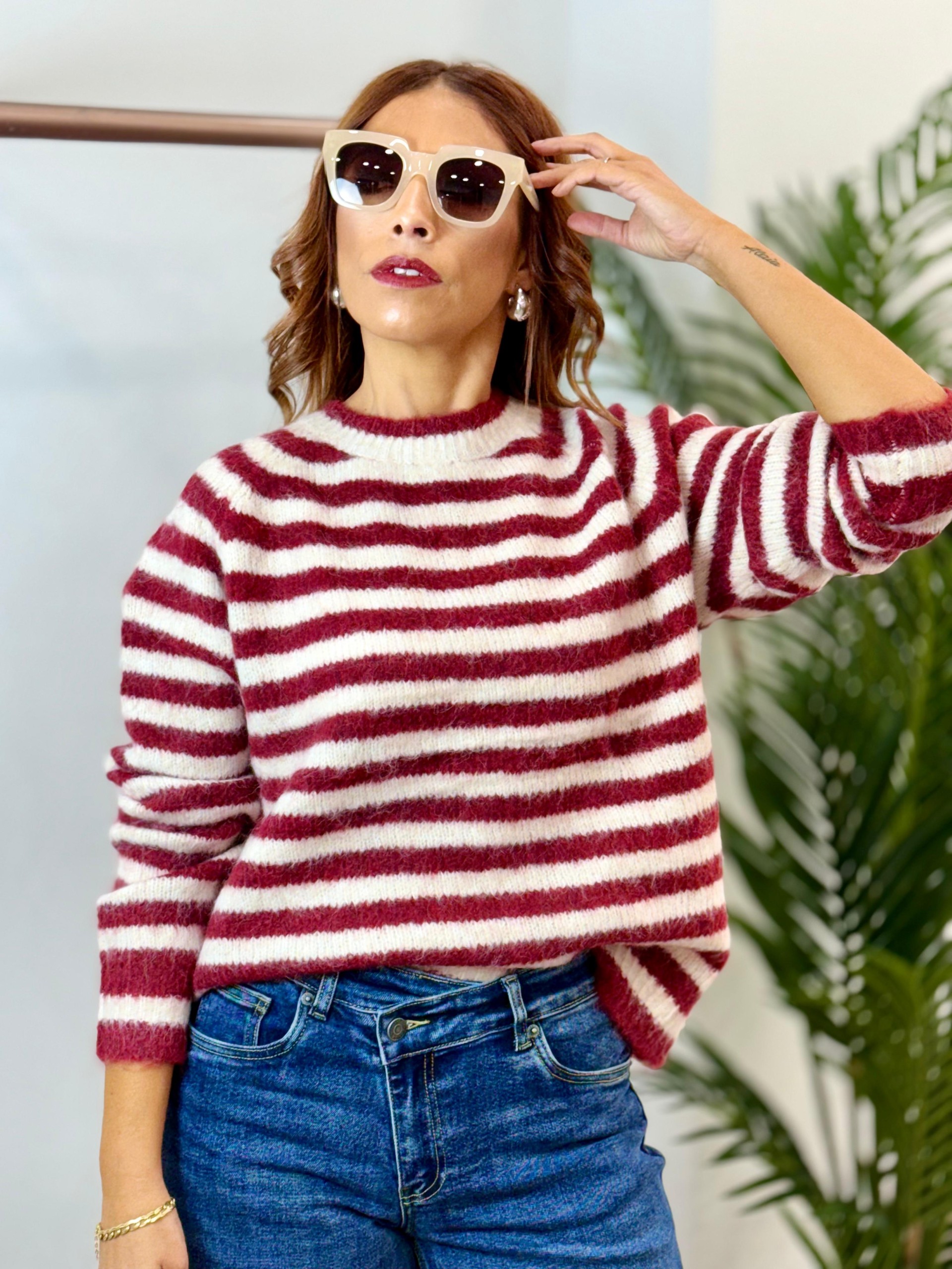 Jersey rayas granate y blanco. Corte over-size. Cuello redondo cerrado.