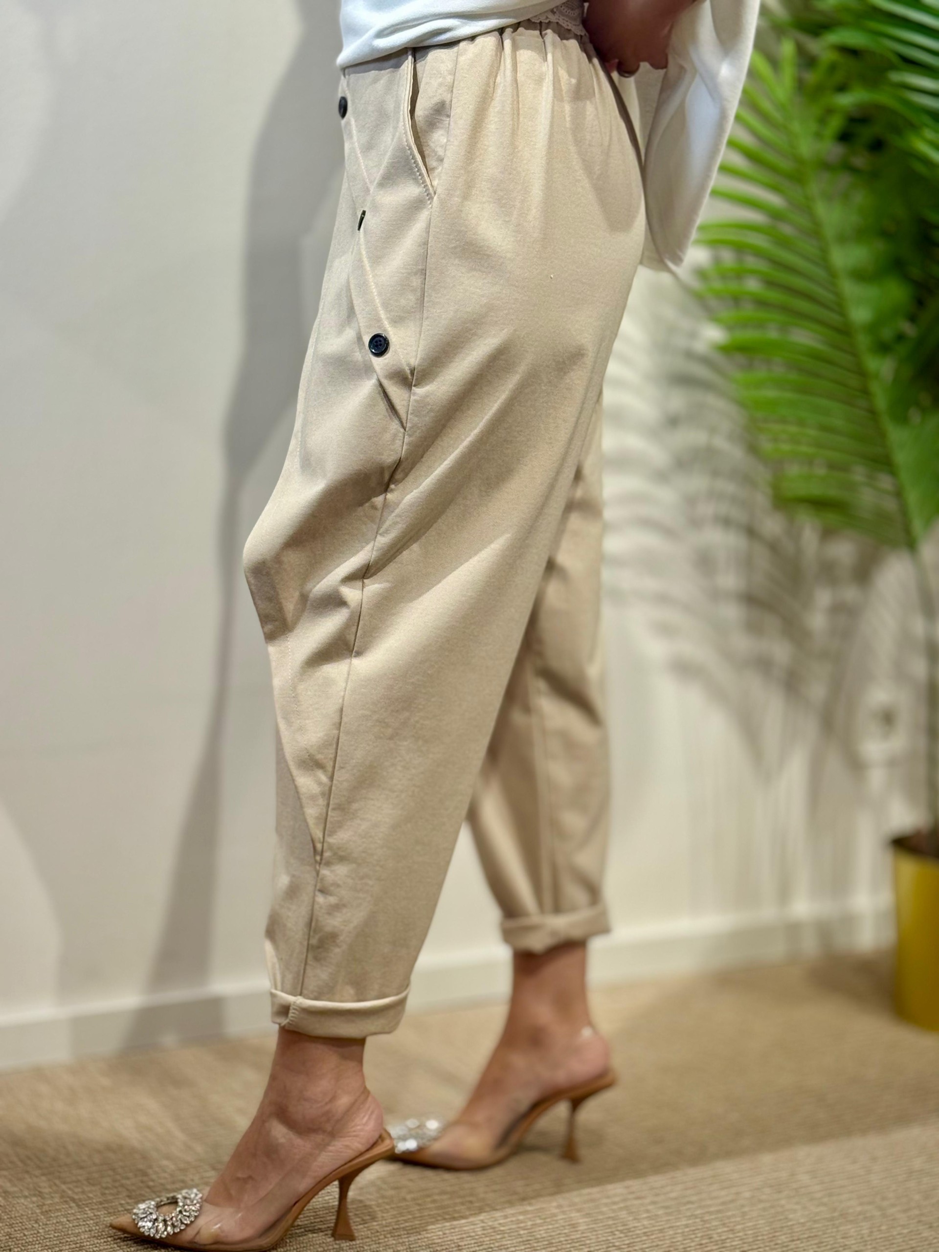Pantalón Baggie Botones Beige. Engomado en cintura y Lleva Bolsillos laterales.