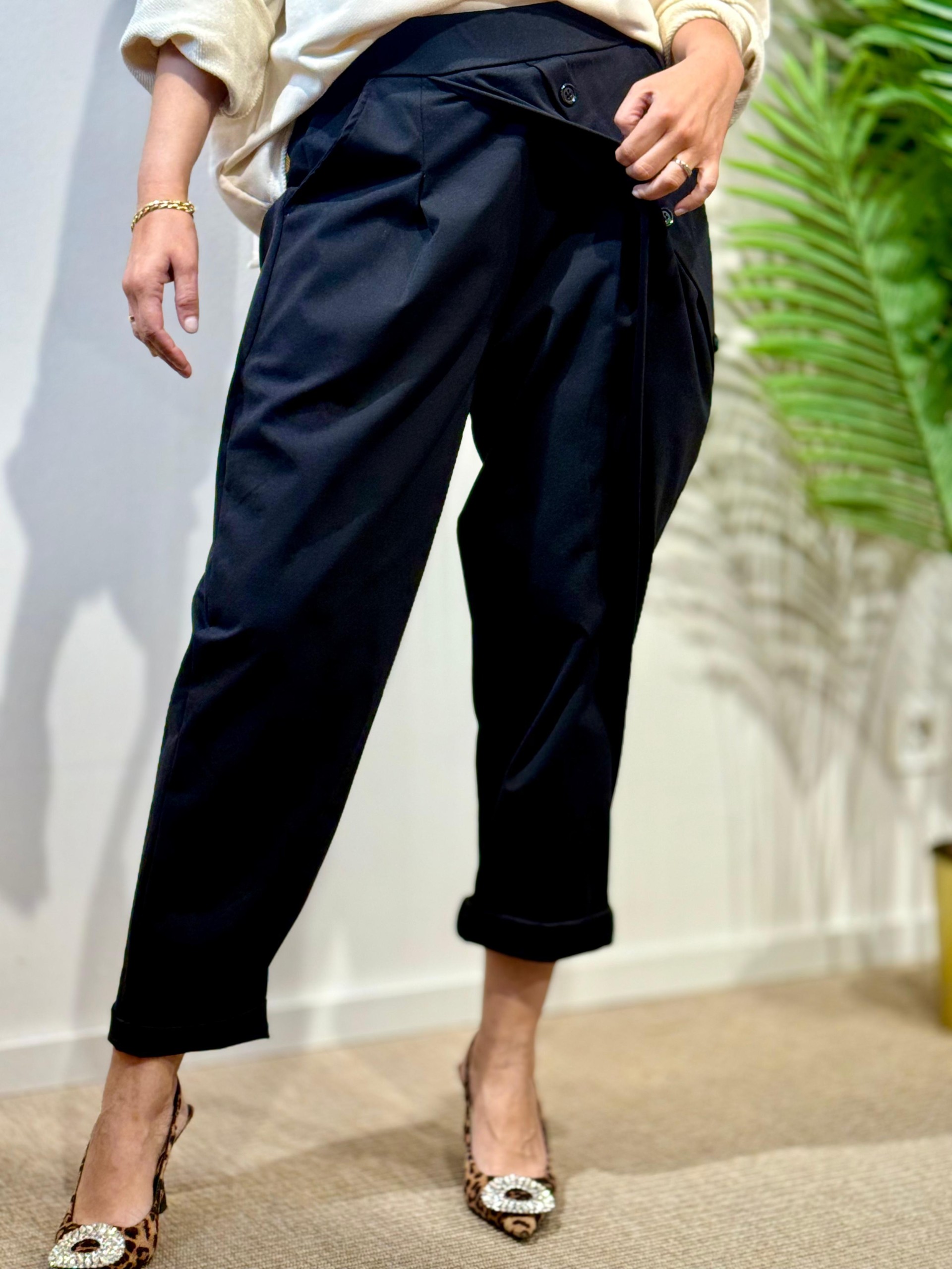 Pantalón Baggie Botones Negro. Engomado en cintura y Lleva Bolsillos laterales.