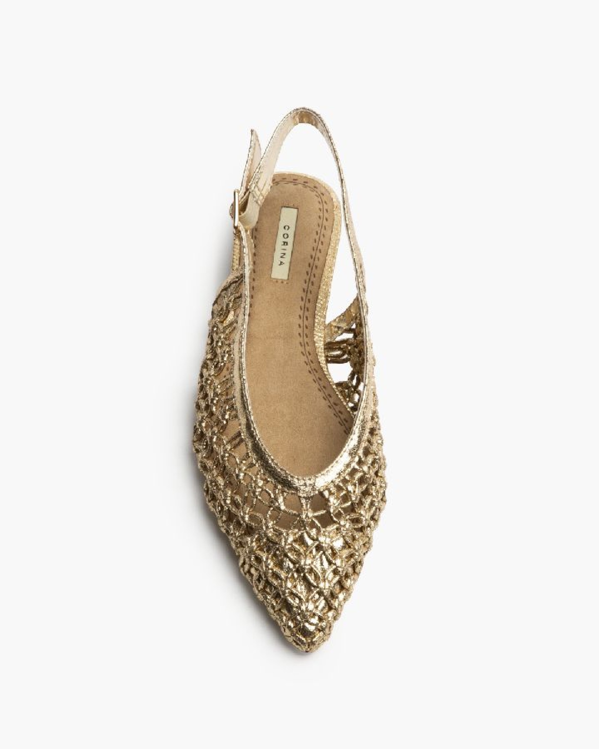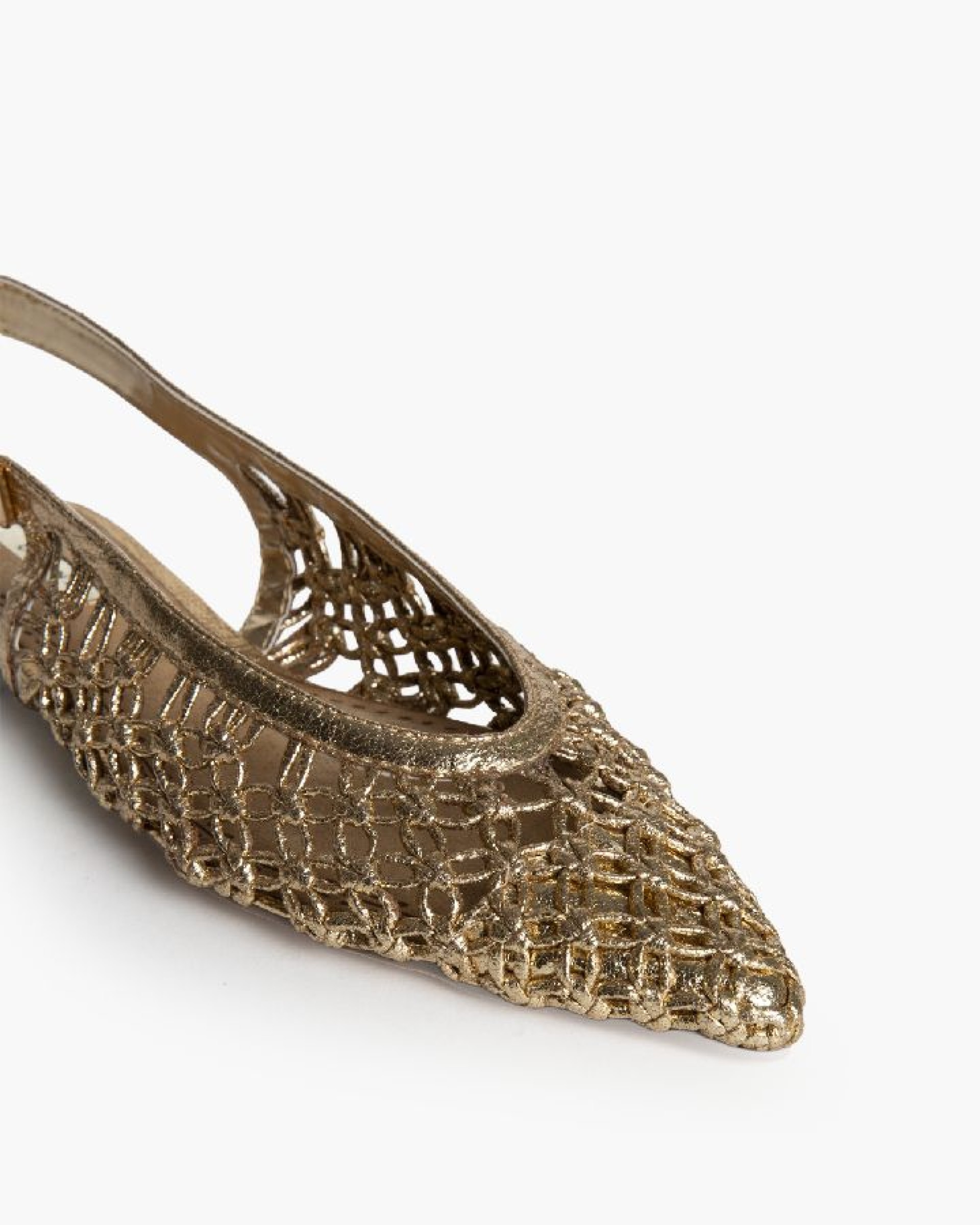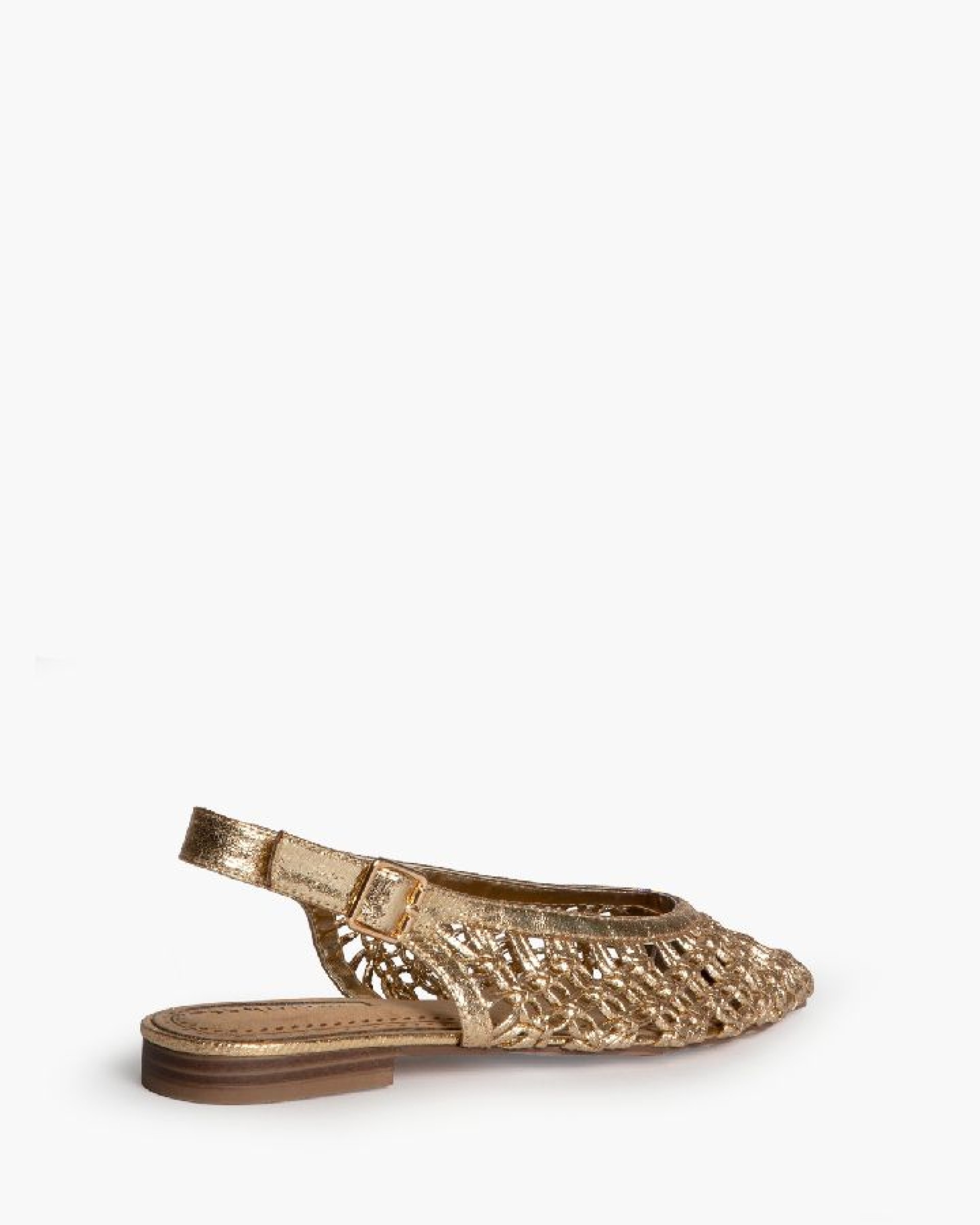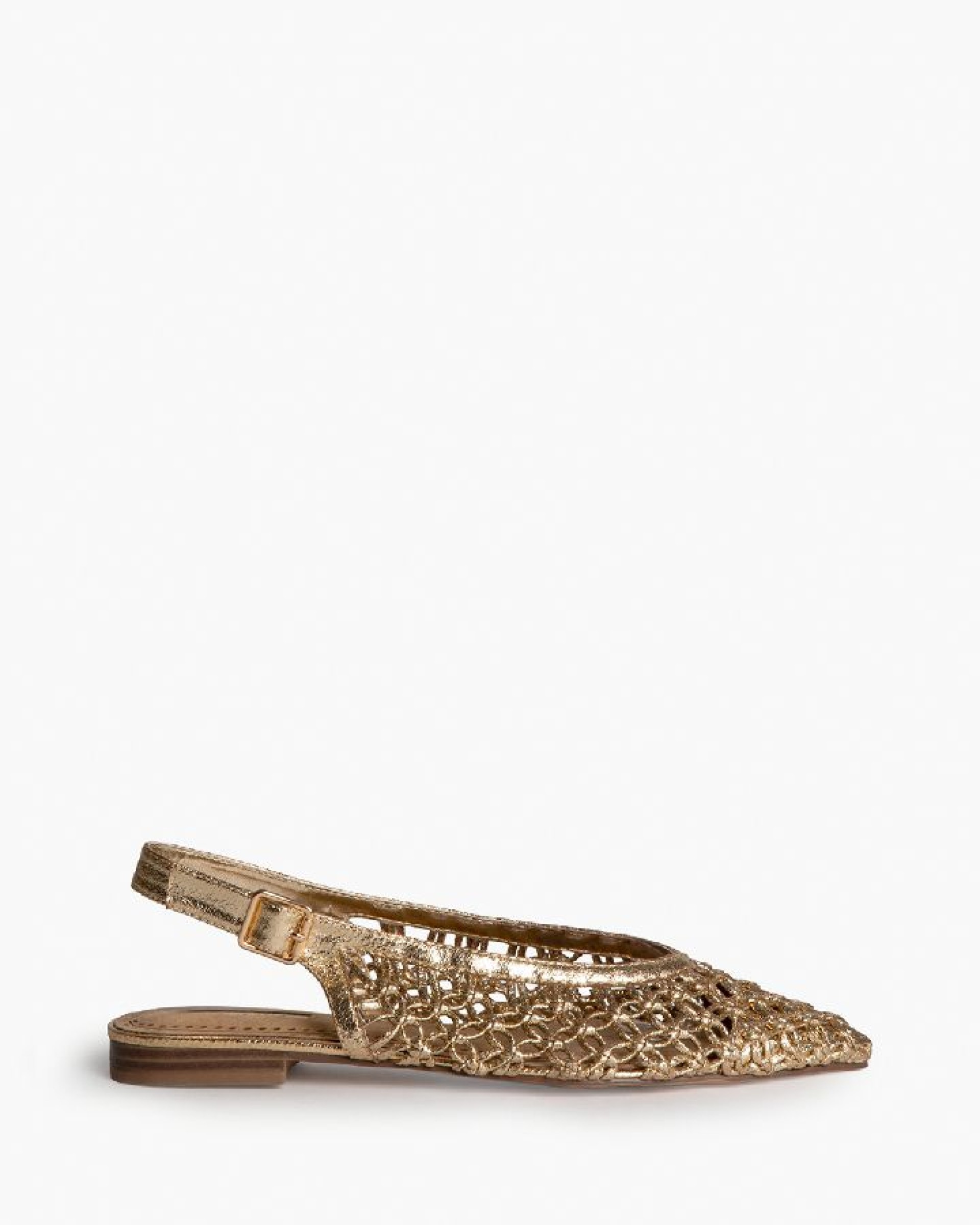 Bailarina destalonada. Corte trenzado. Acabado en punta, escote re-dondo. Cierre mediante hebilla.