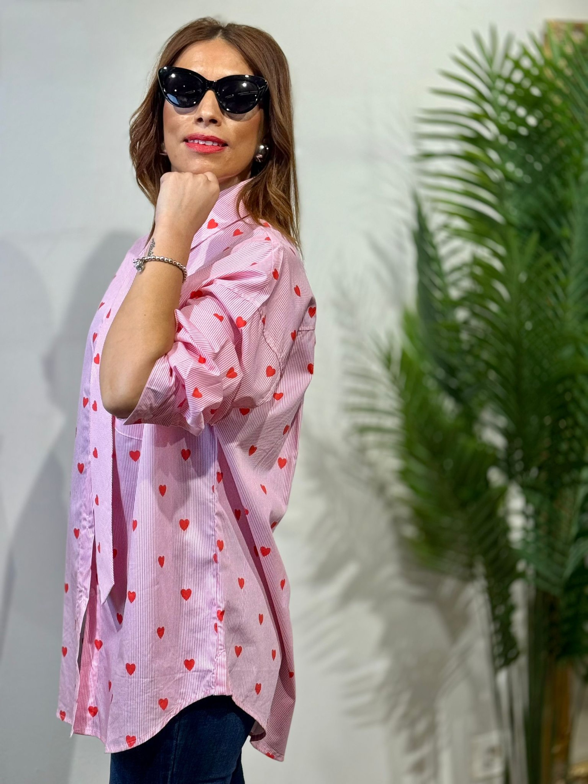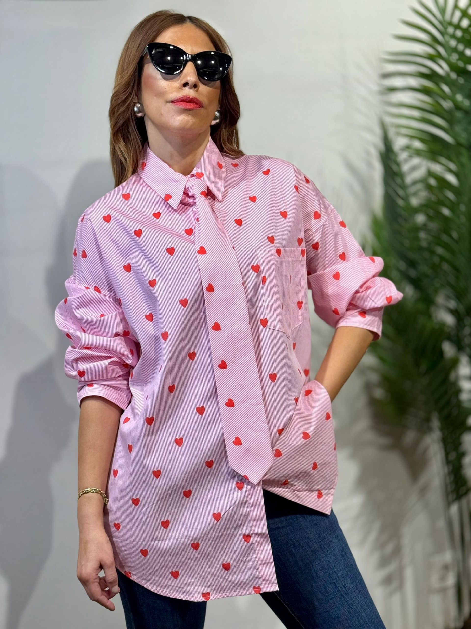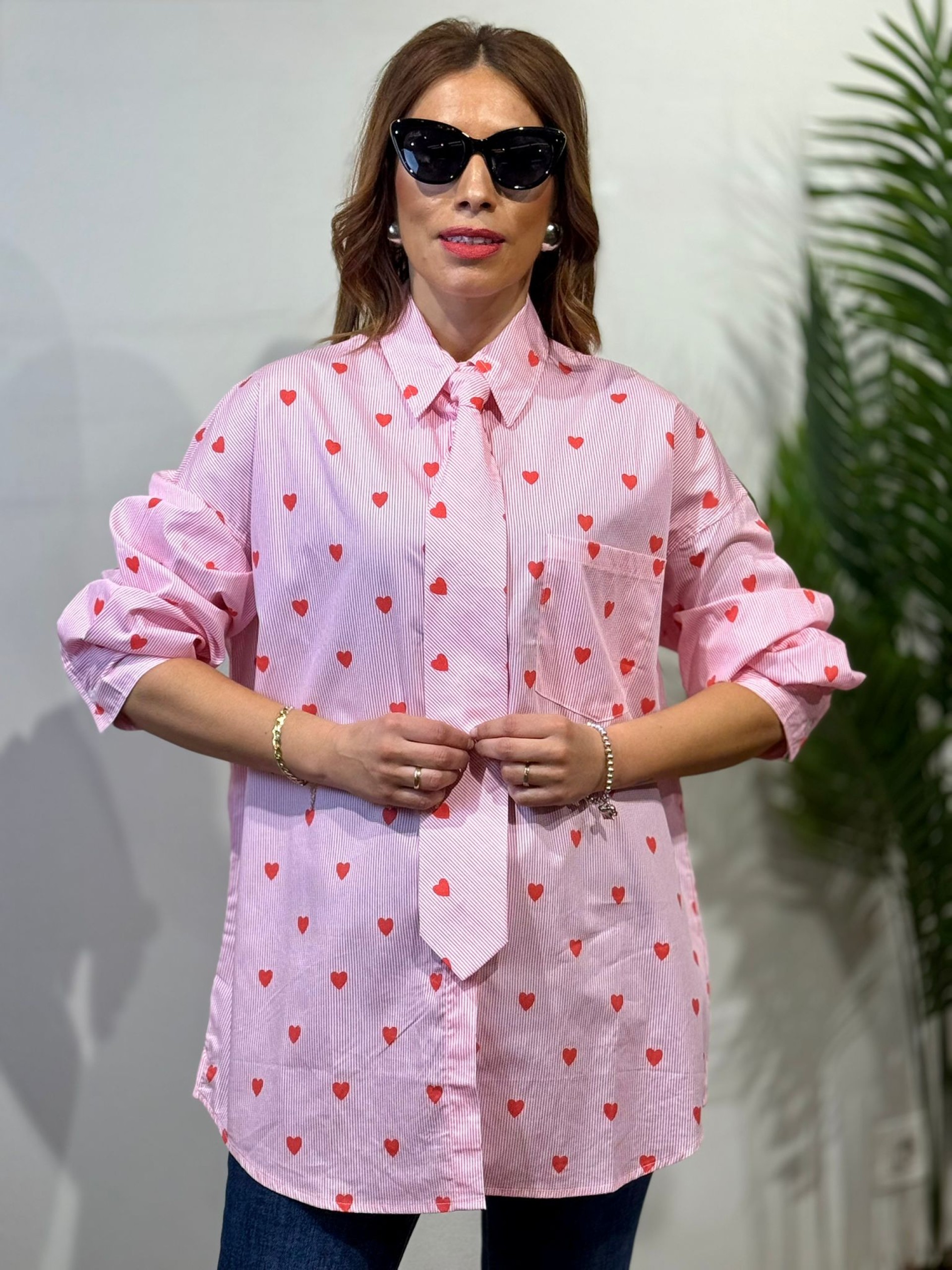 Blusa Corbata Desmontable Rayas Rosa y estampado de corazones rojos. corte oversize y manga larga.