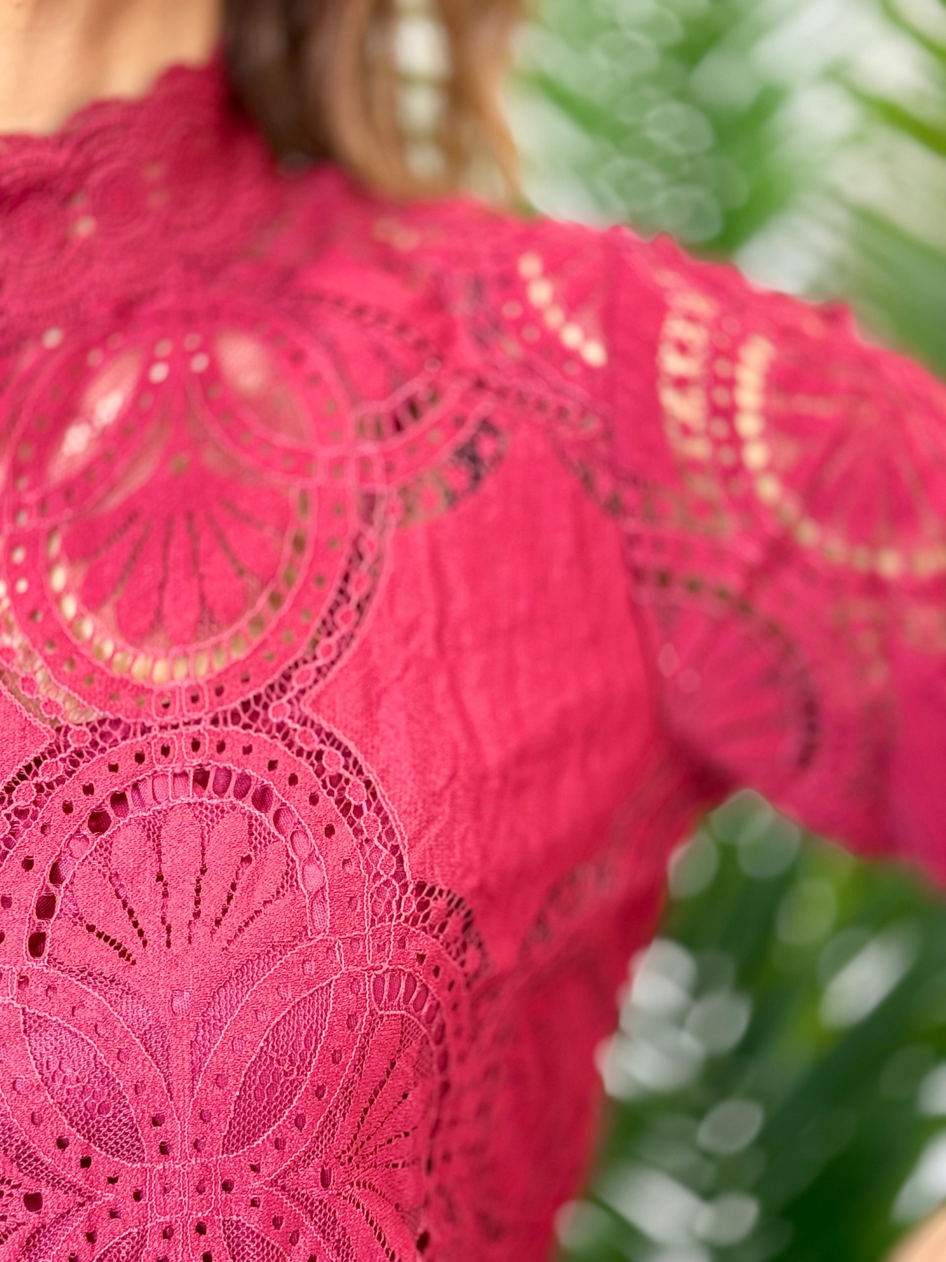 Blusa troquelada granate. Incluye top interior. Cuello alto y puños engomados.