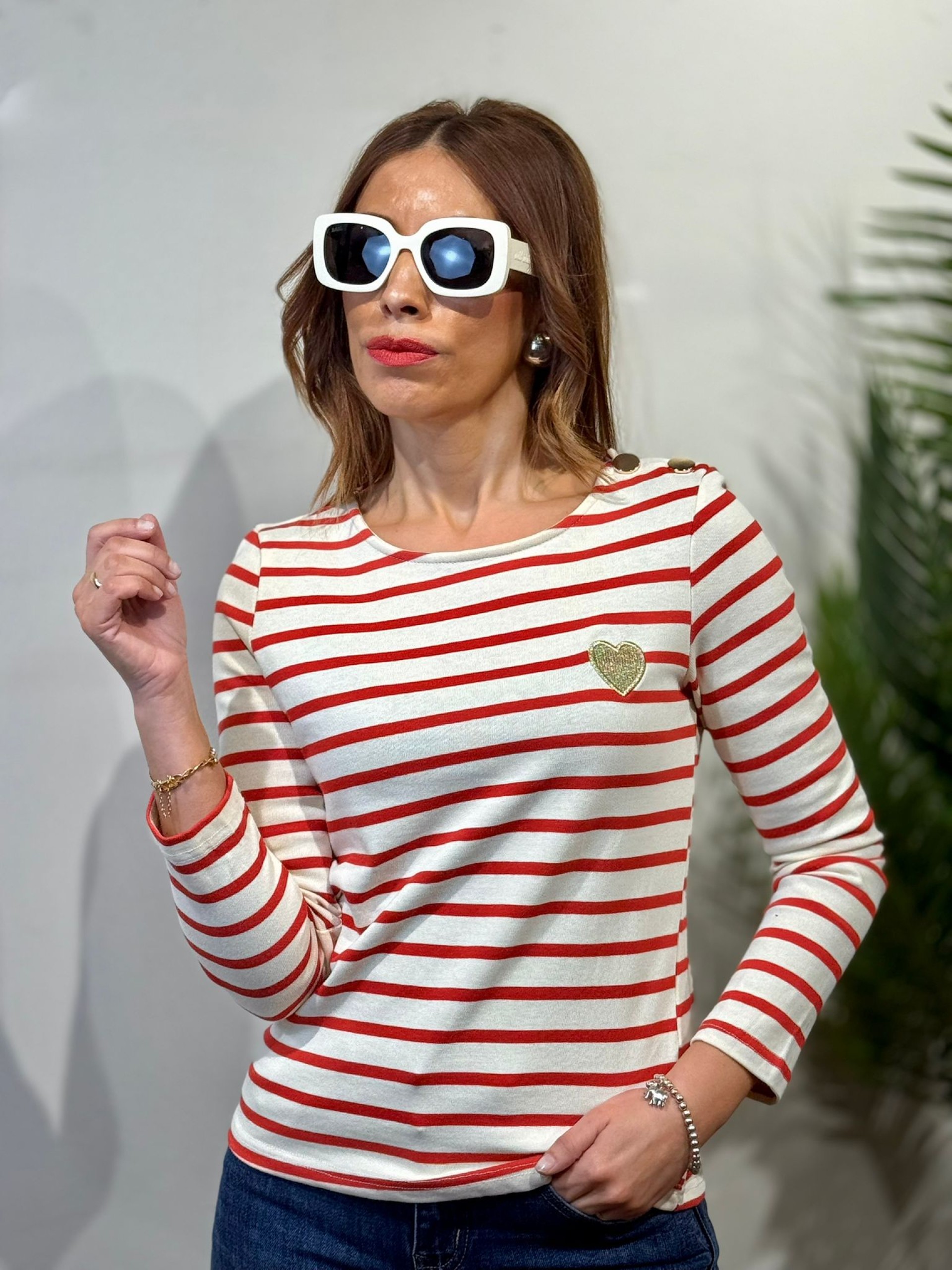 Camiseta Rayas Roja Corazon. Manga larga y tejido de algodón de alta calidad. Corazón bordado dorado en lateral.