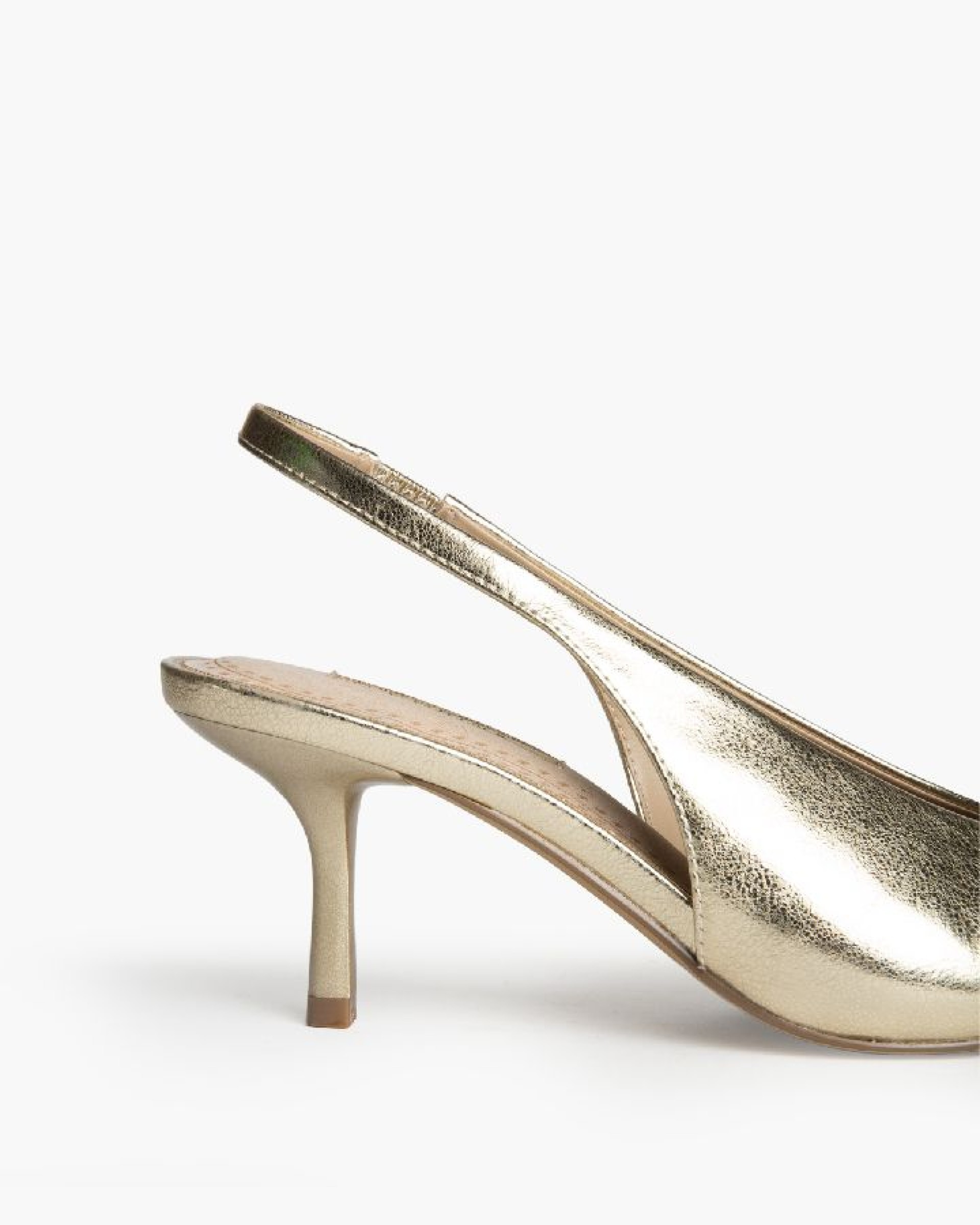 Salon destalonado de tacón medio. Acabado en punta, escote subido.