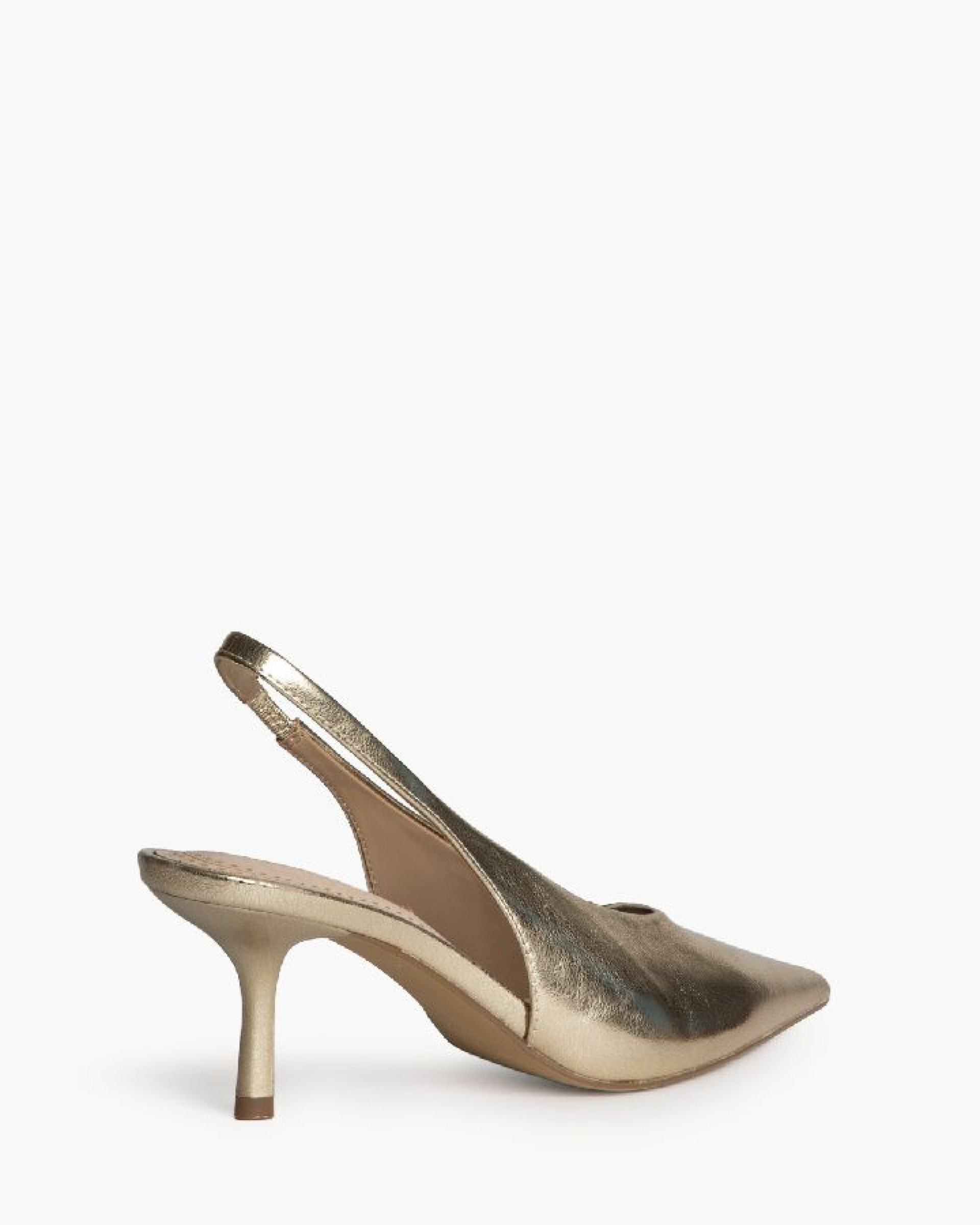 Salon destalonado de tacón medio. Acabado en punta, escote subido. Tira trasera con pieza elástica. Altura de la suela 7 cm. 37(2) 38(3) 39(3) 40(2) 41(1) (Tallaje habitual)