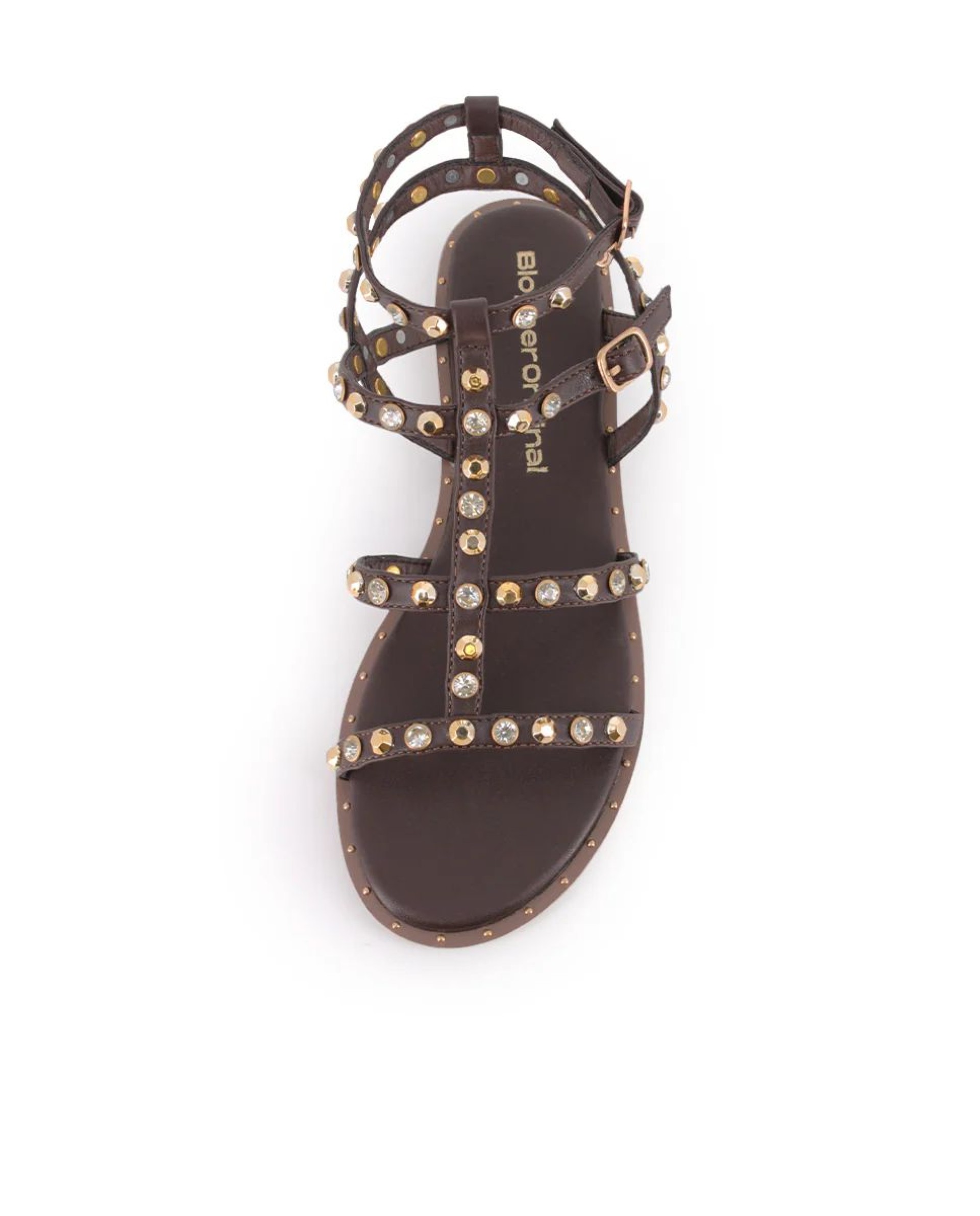 Sandalia romana con pedrería y tachas Marrón en piel sintética y detalles dorados.