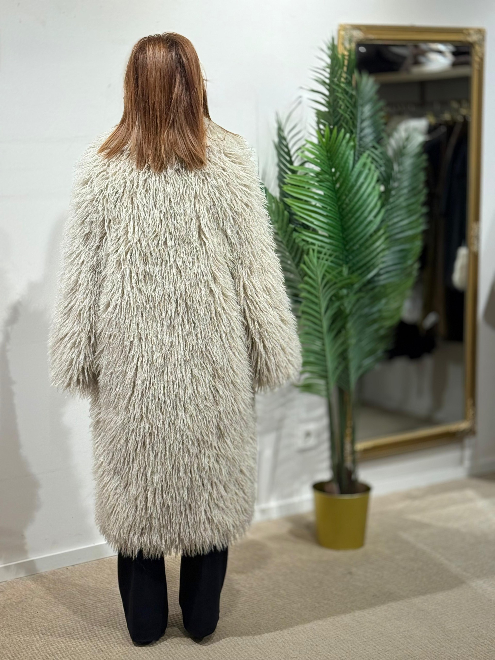 Abrigo pelo rizado largo beige. Lleva forro interior y bolsillos. Cierre central y solapas.