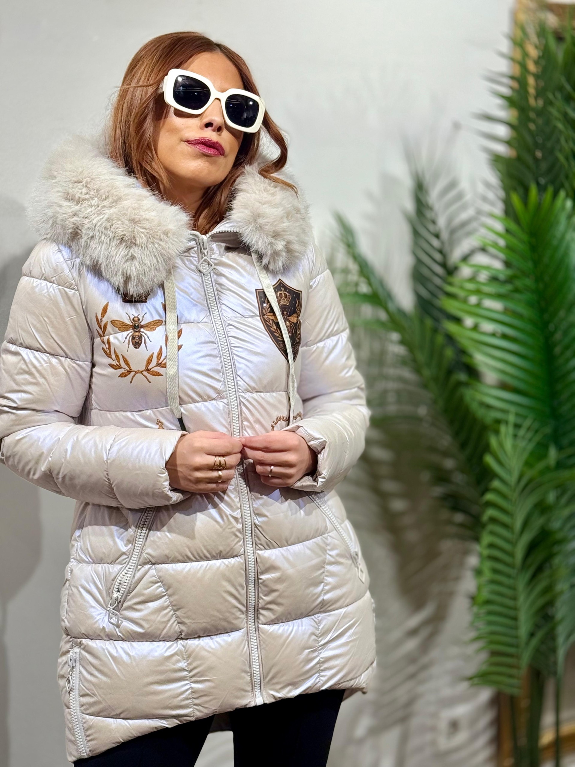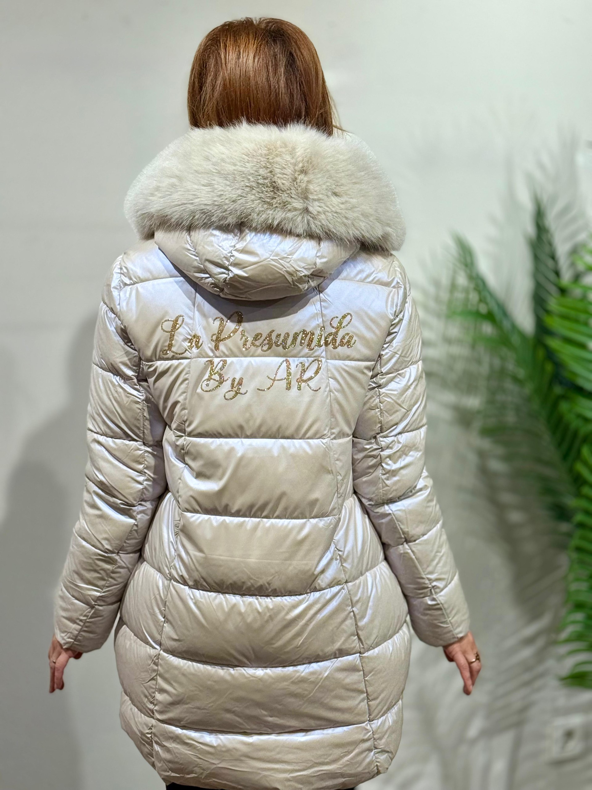 Acolchado satinado diseño LP hielo. Contiene capucha con pelo desmontable. Lleva bolsillos y cremallera central. Diseños con strass y glitter exclusivo By La Presumida.