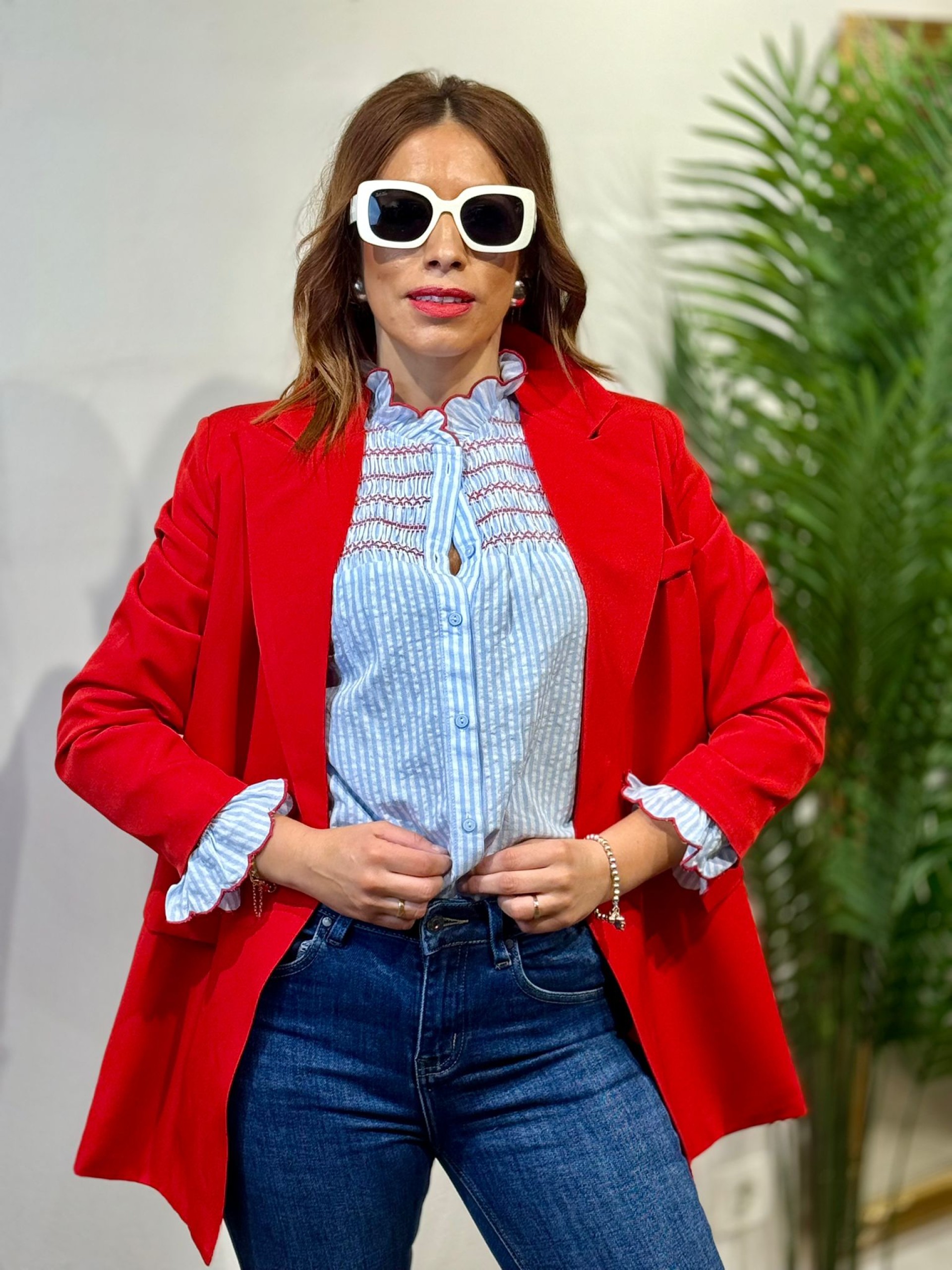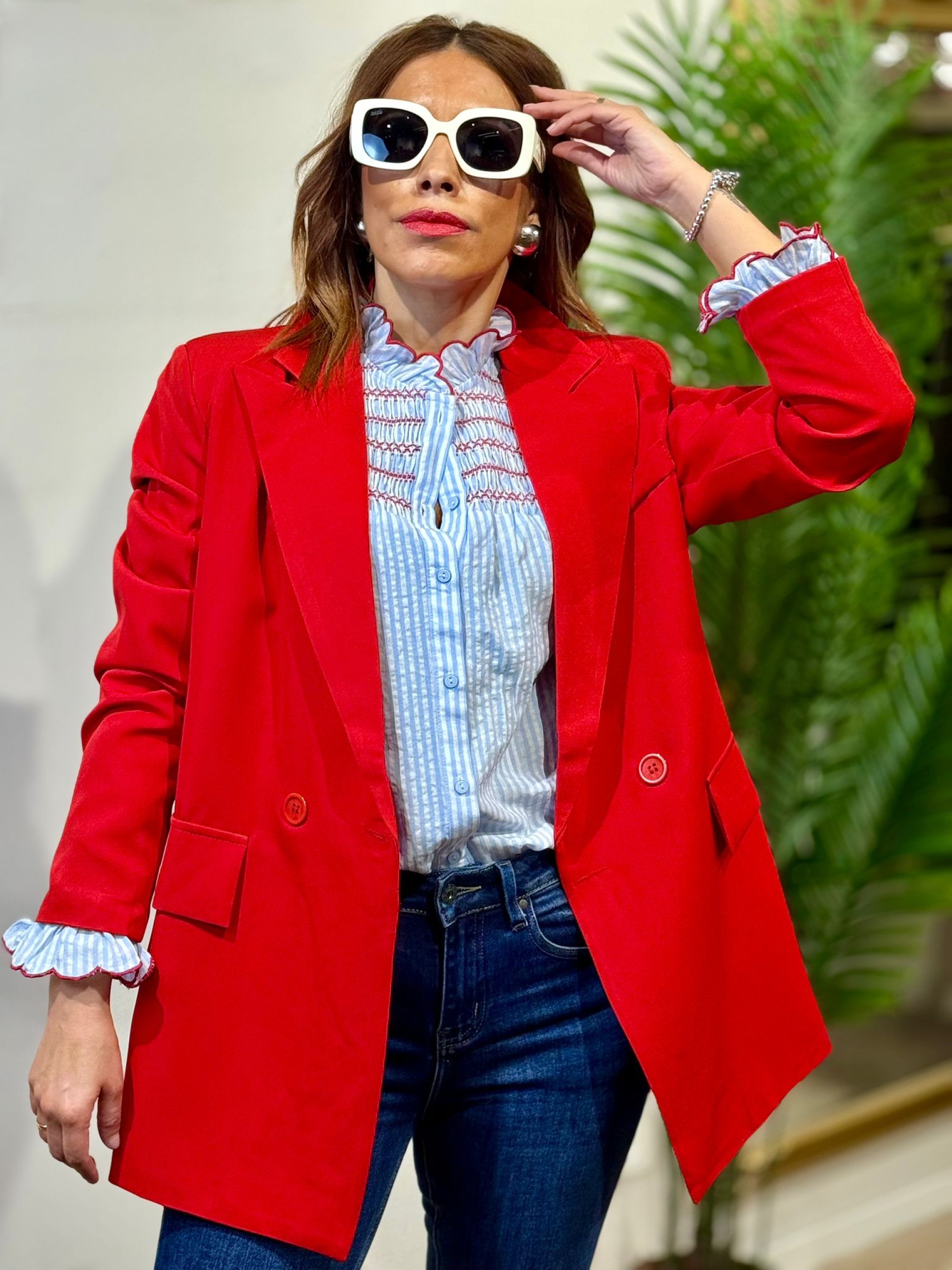 Blazer basic Roja. Doble botonadura y corte recto. Forro interior y bolsillos laterales.