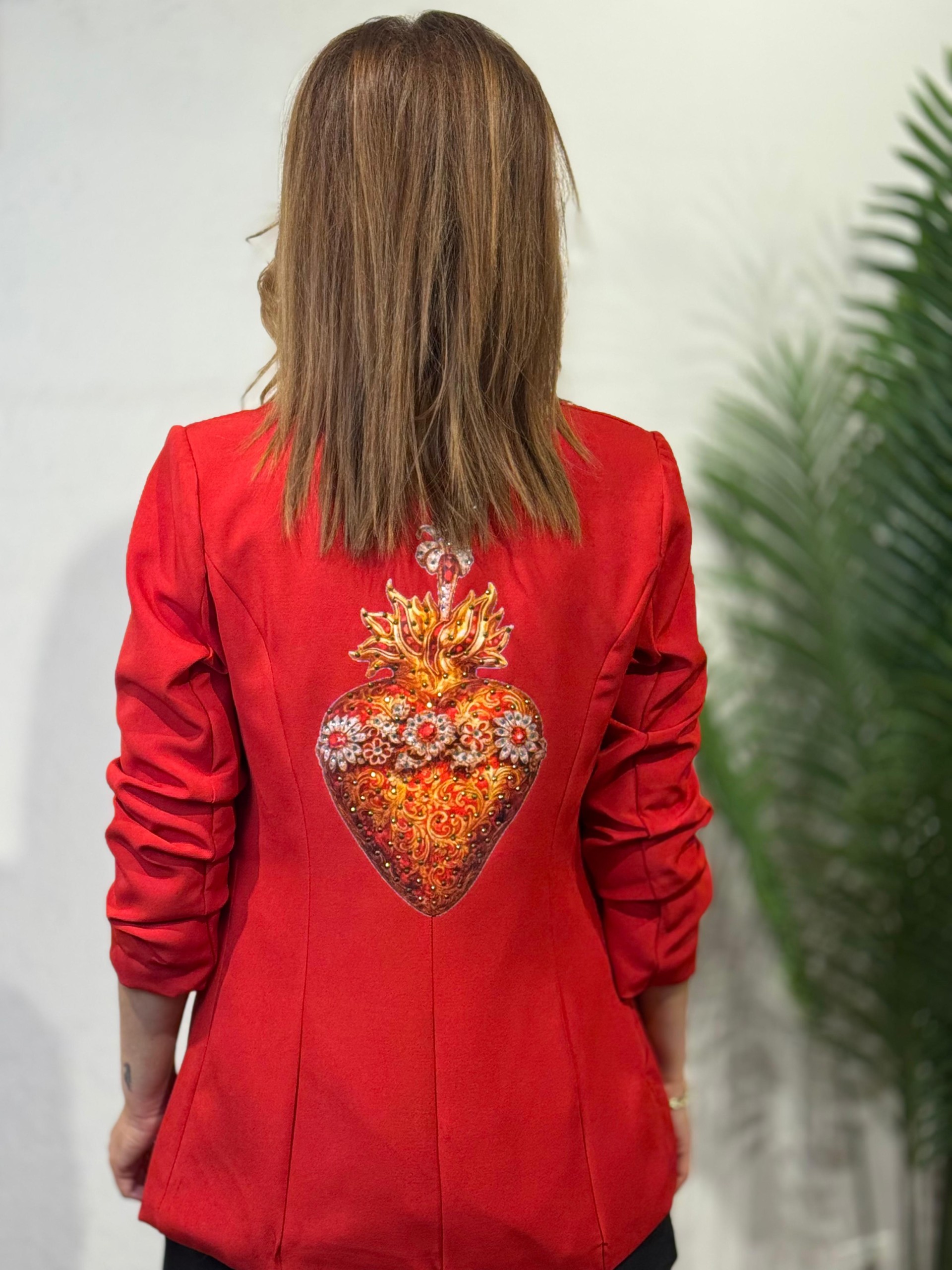 Blazer diseño corazón Roja. Lleva forro interior y tachuelas doradas en solapas. Manga fruncida y corte entallado.