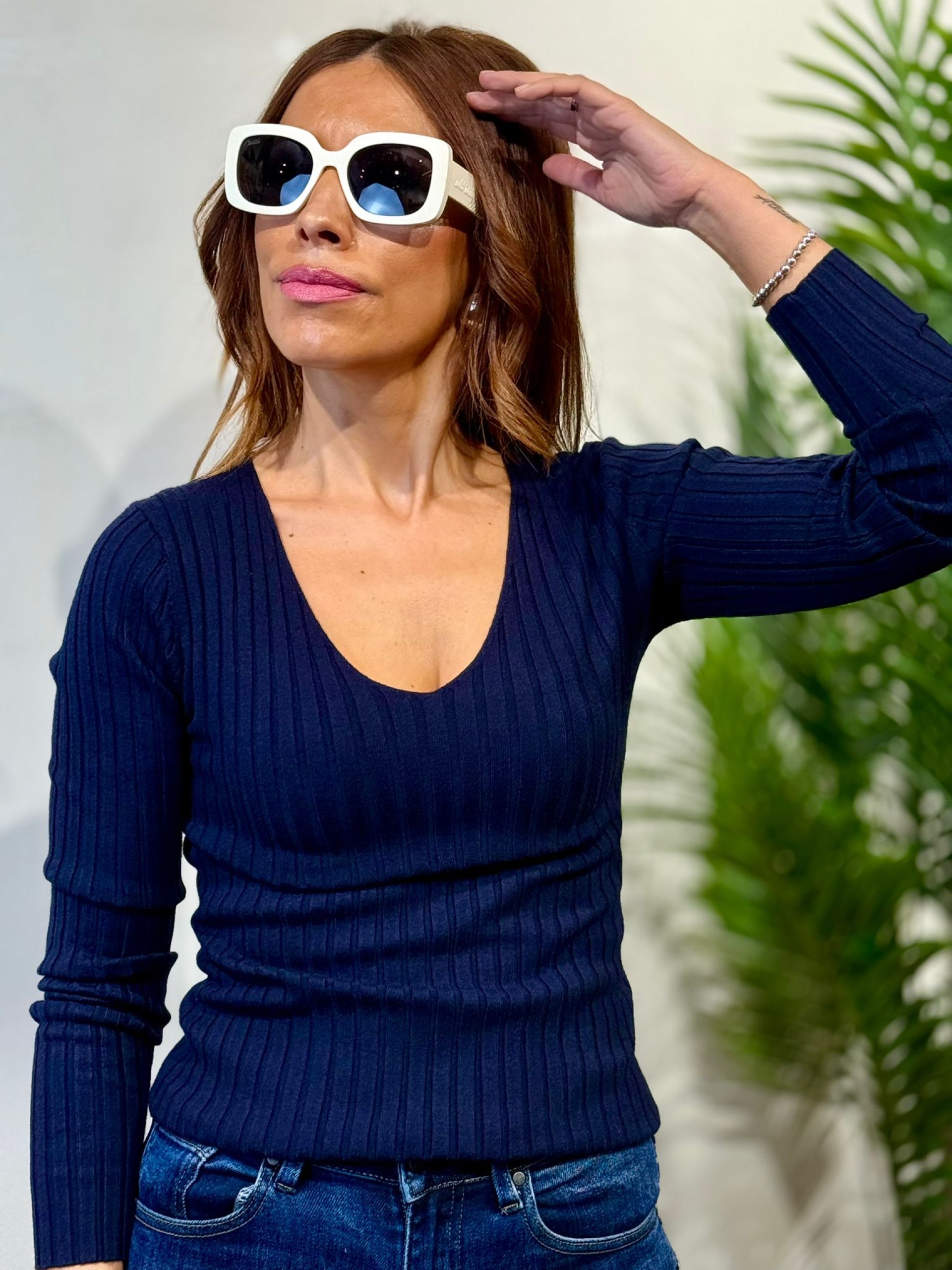 Jersey canalé basic marino. Escote en pico y manga larga.