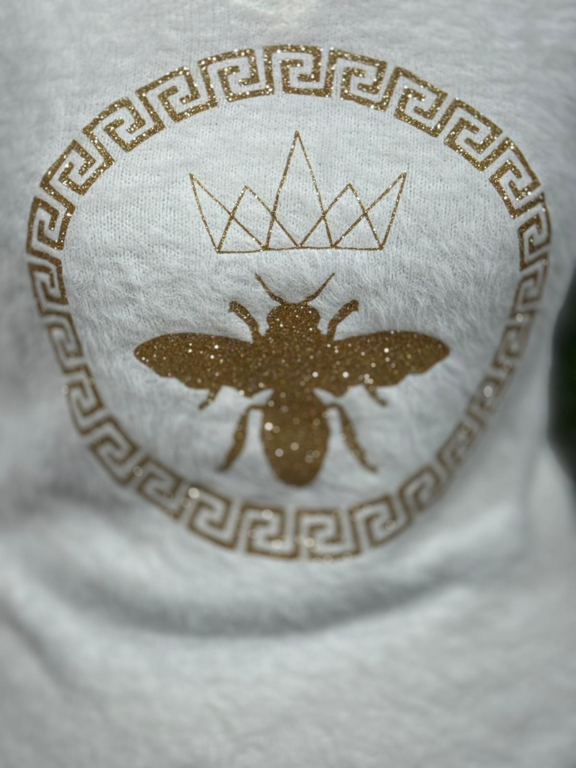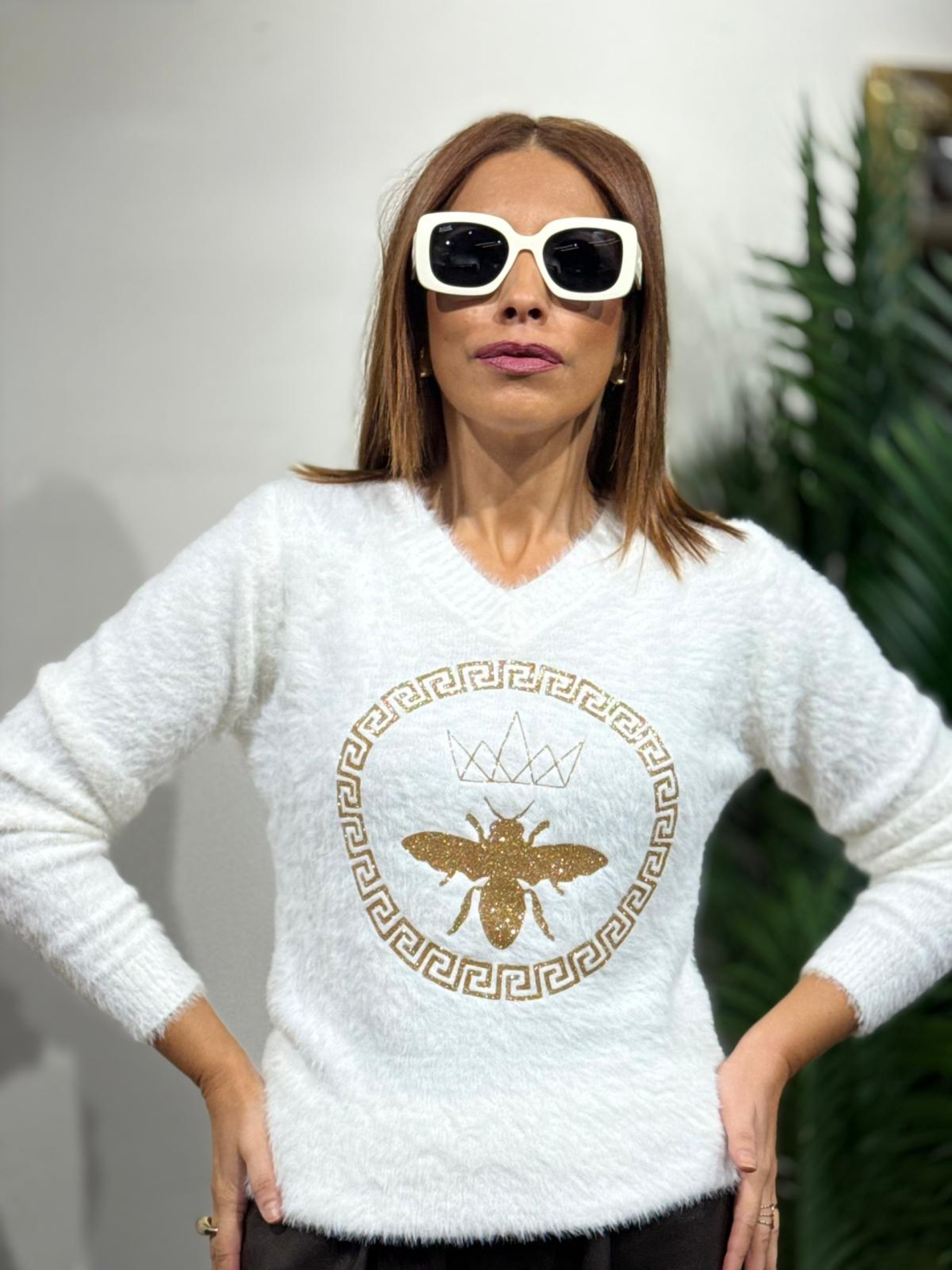 Jersey pelo suave blanco roto y dorado. Escote en pico y manga larga. Estampación diseño LP dorado.