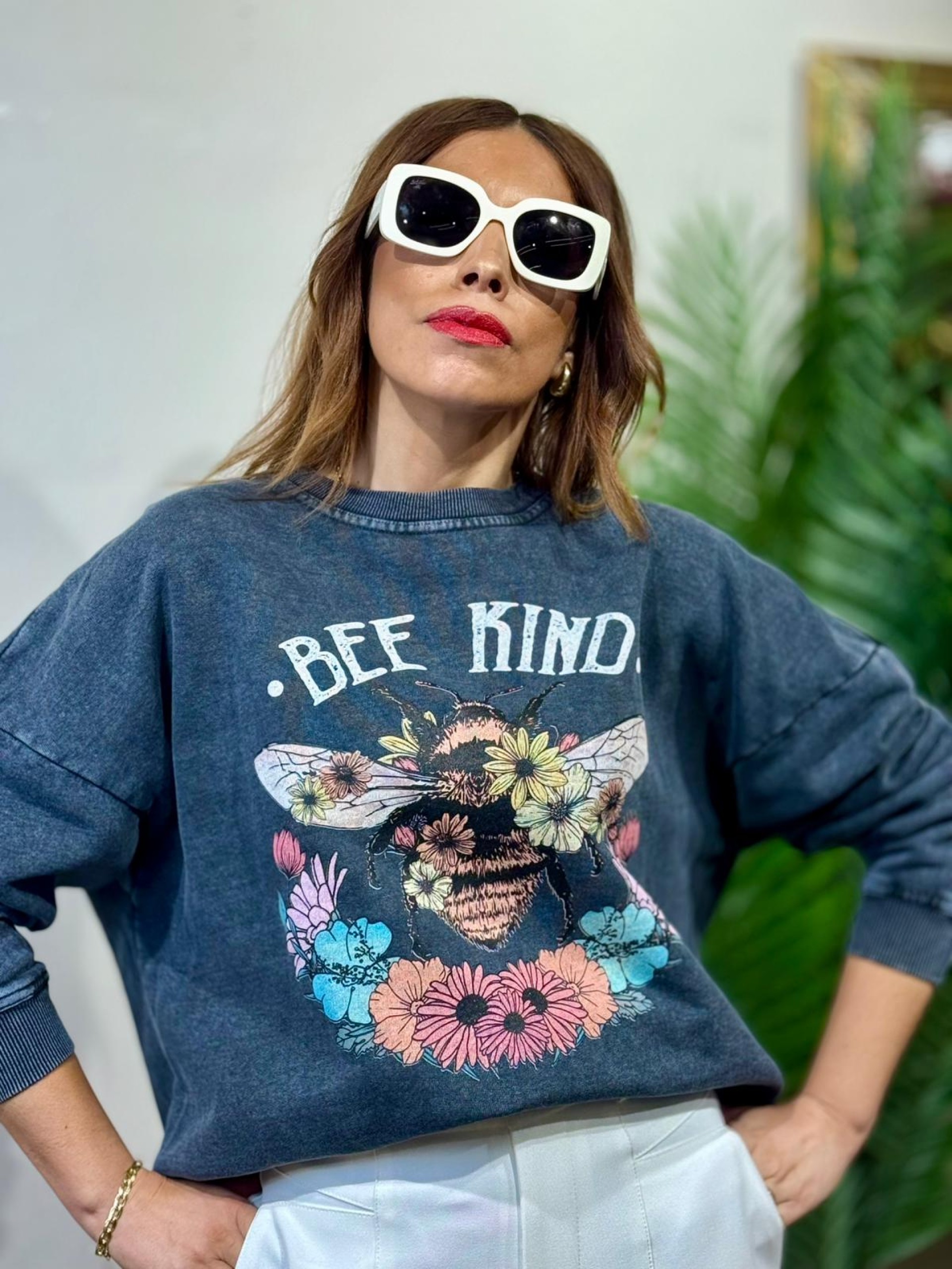 Sudadera BEE gris efecto desgastado. Corte oversize. Engomada en puños y bajo.