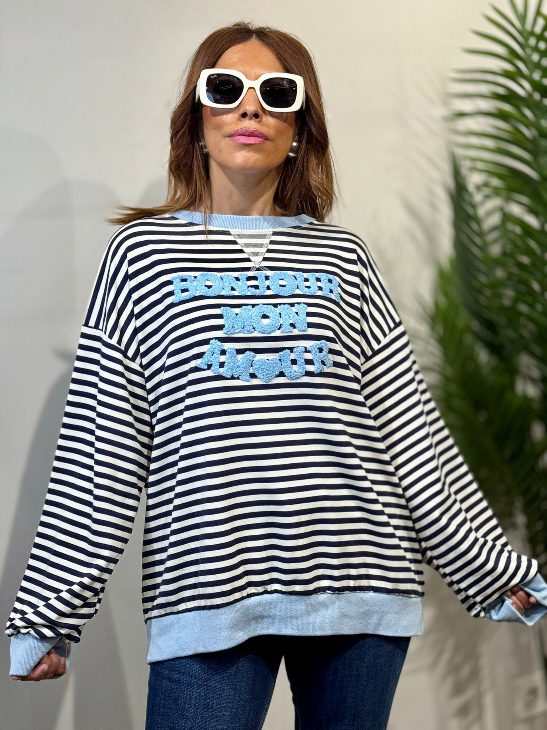 Sudadera BONJOUR bordado rayas marino y blanco. Corte oversize. Cuello, puños y bajo engomados en azul cielo.