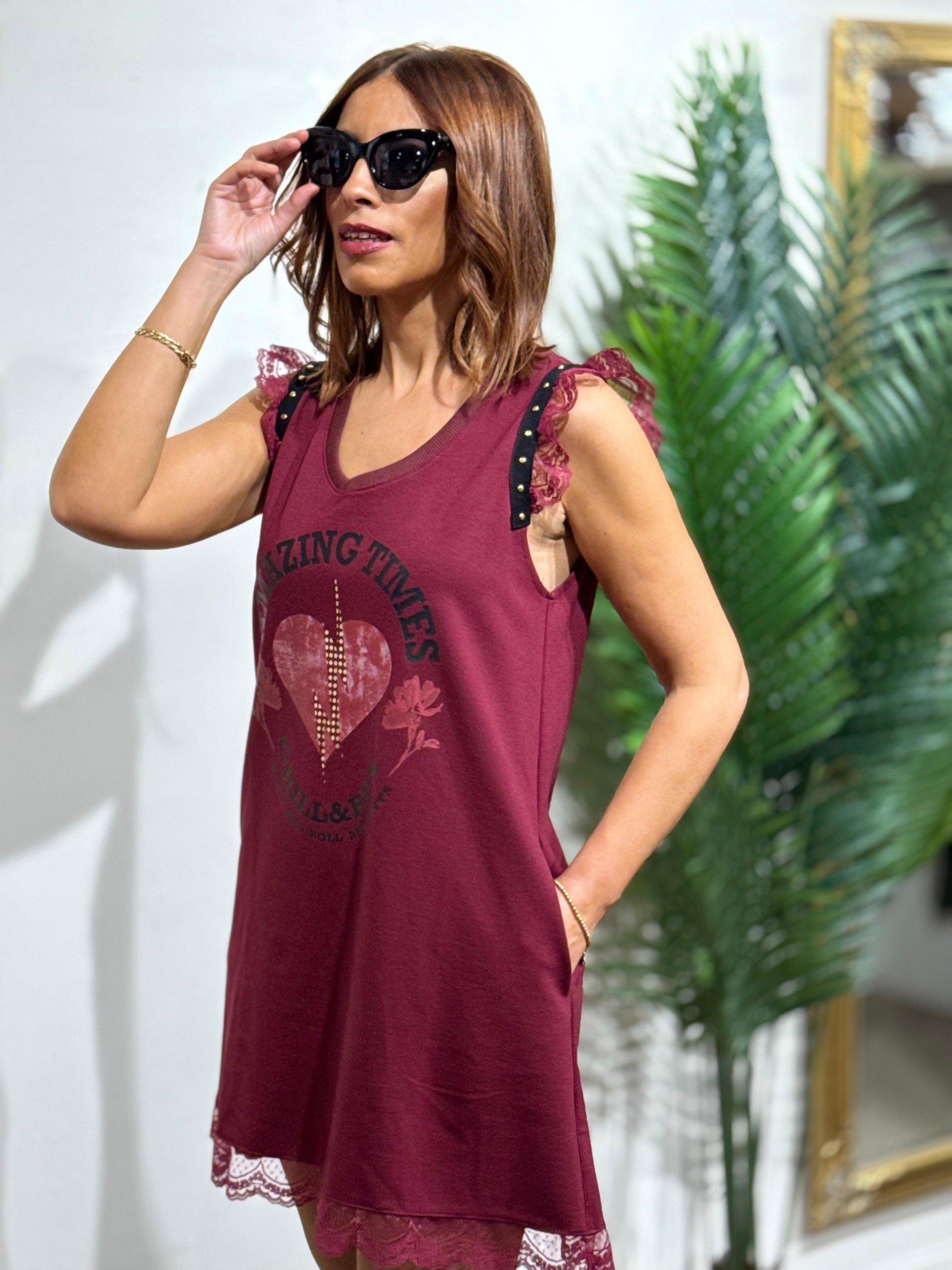 Vestido Amazing encaje Burdeos. Vestido corto en algodón sin mangas con encaje en bajo y mangas. Estampación de alta calidad frontal. Lleva bolsillos y corte evasé.