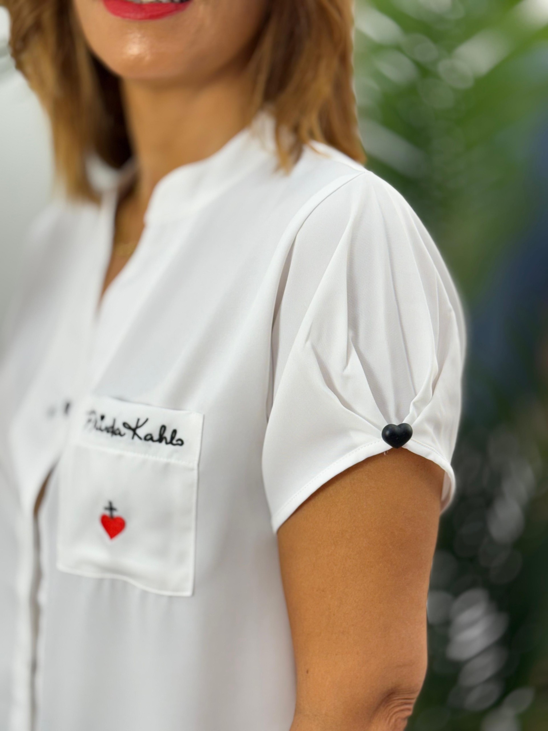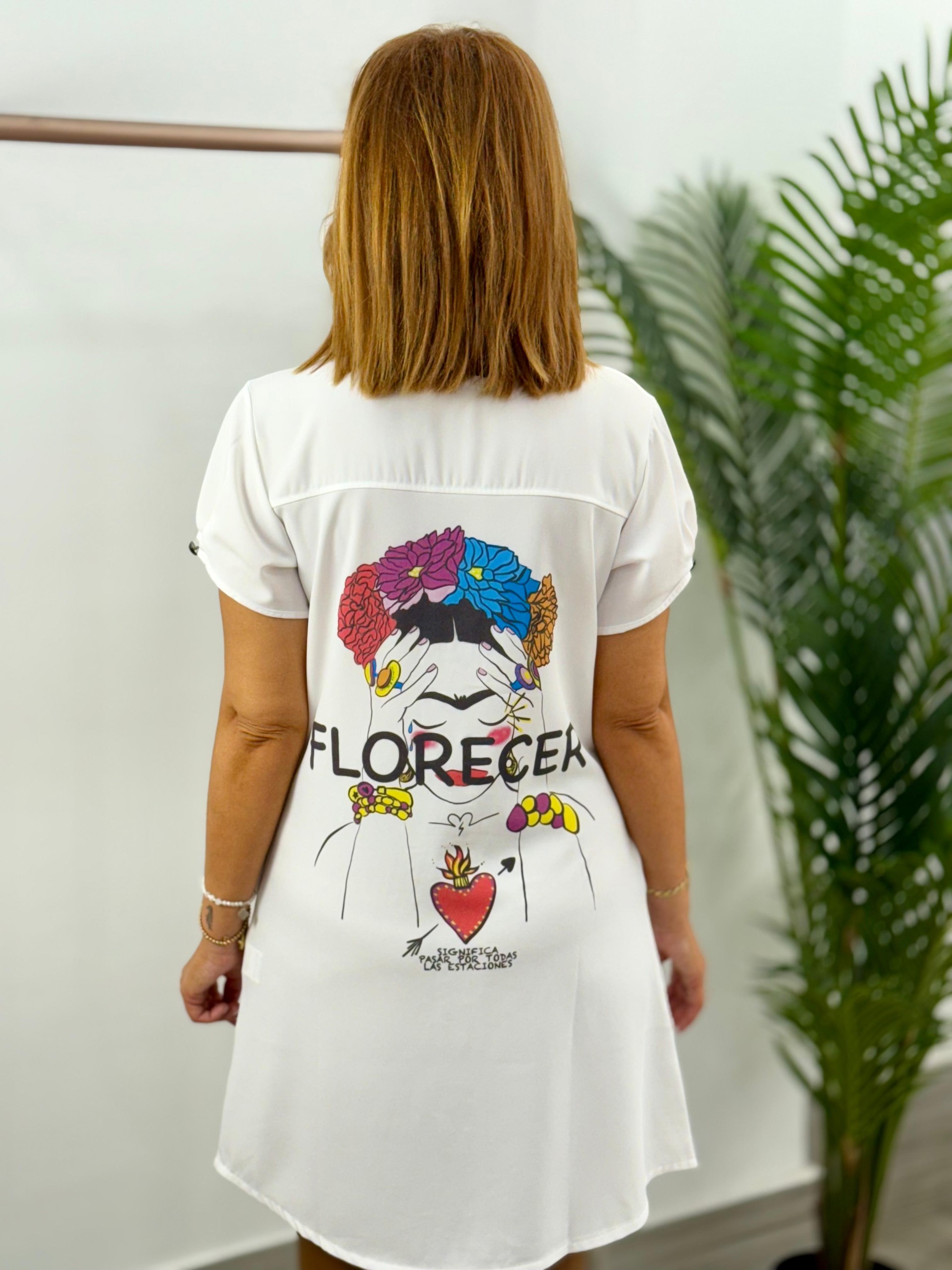 Vestido “Florece” blanco . Botonadura central y detalle de botonadura con forma corazón en la manga. Tiene bolsillos y Mensaje “Florece” en la espalda.