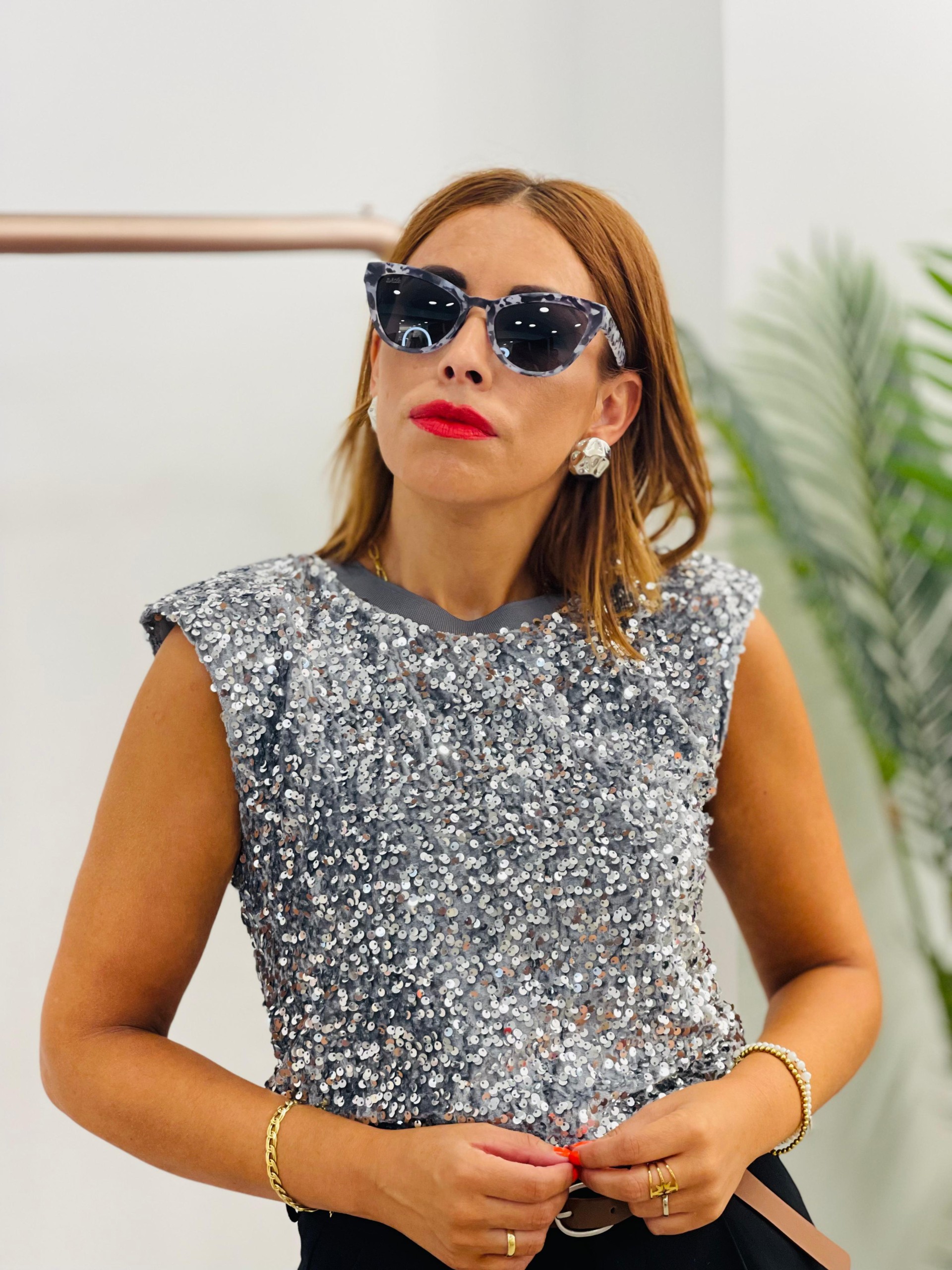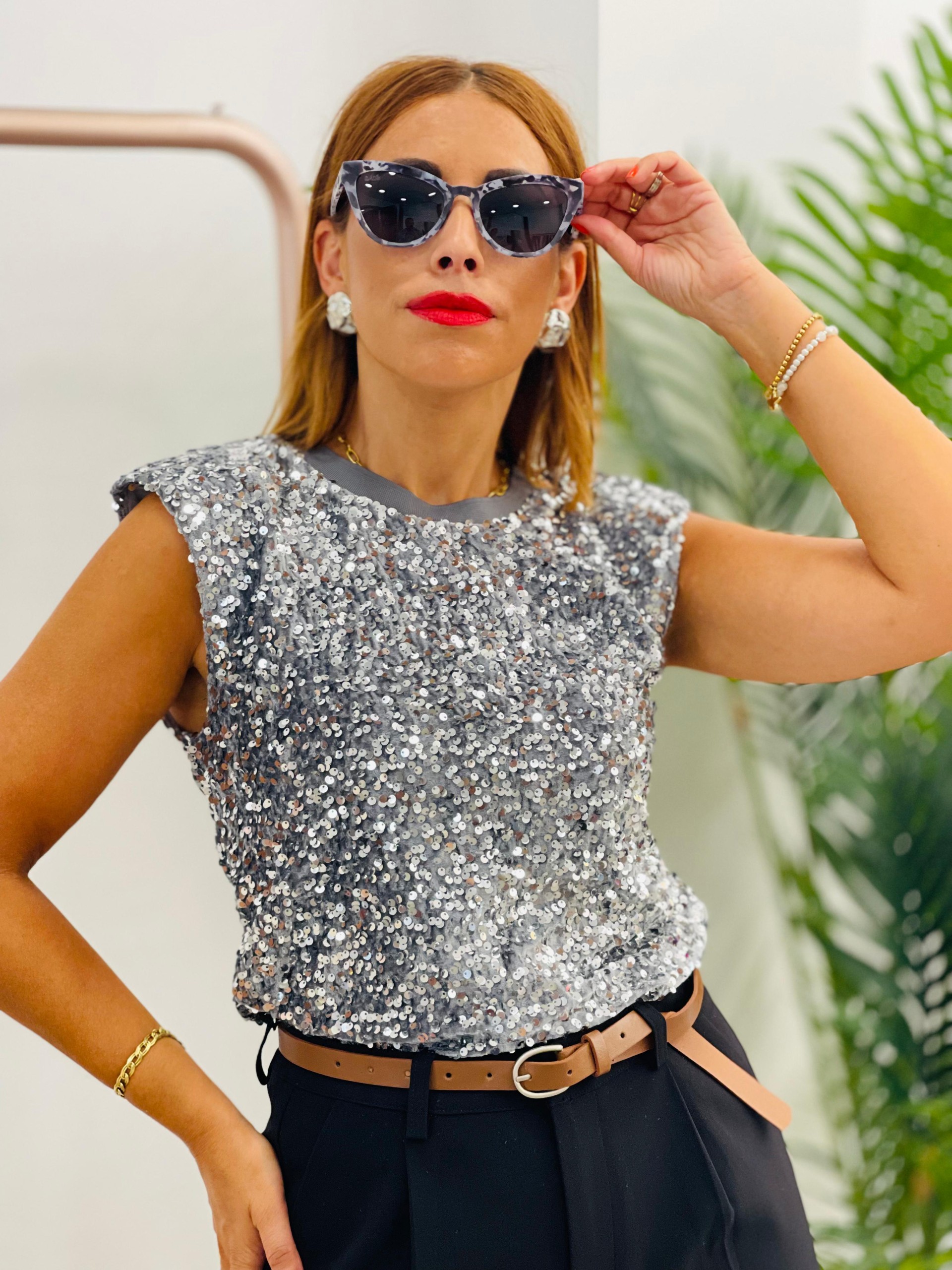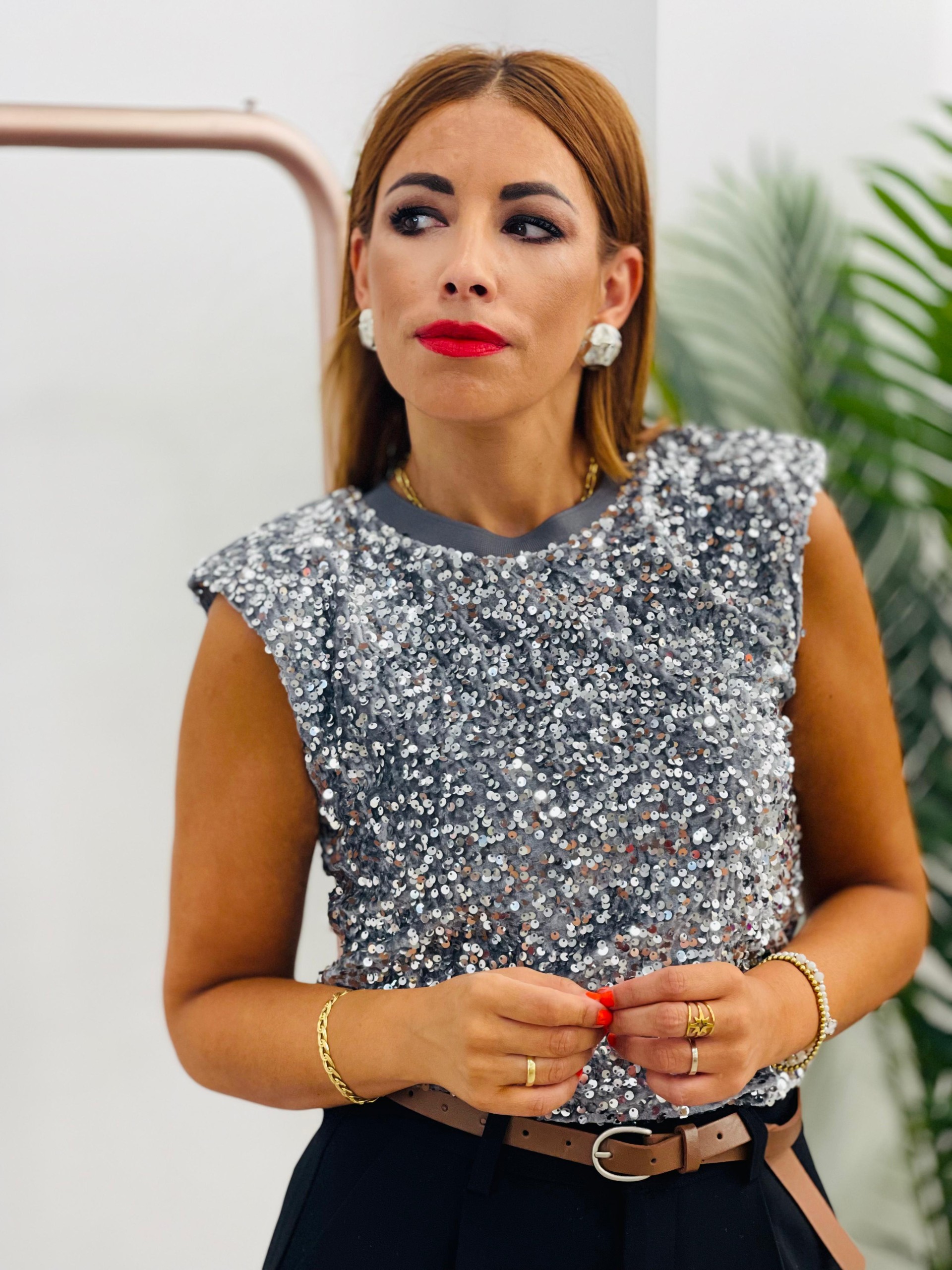 Top hombreras y lentejuelas gris